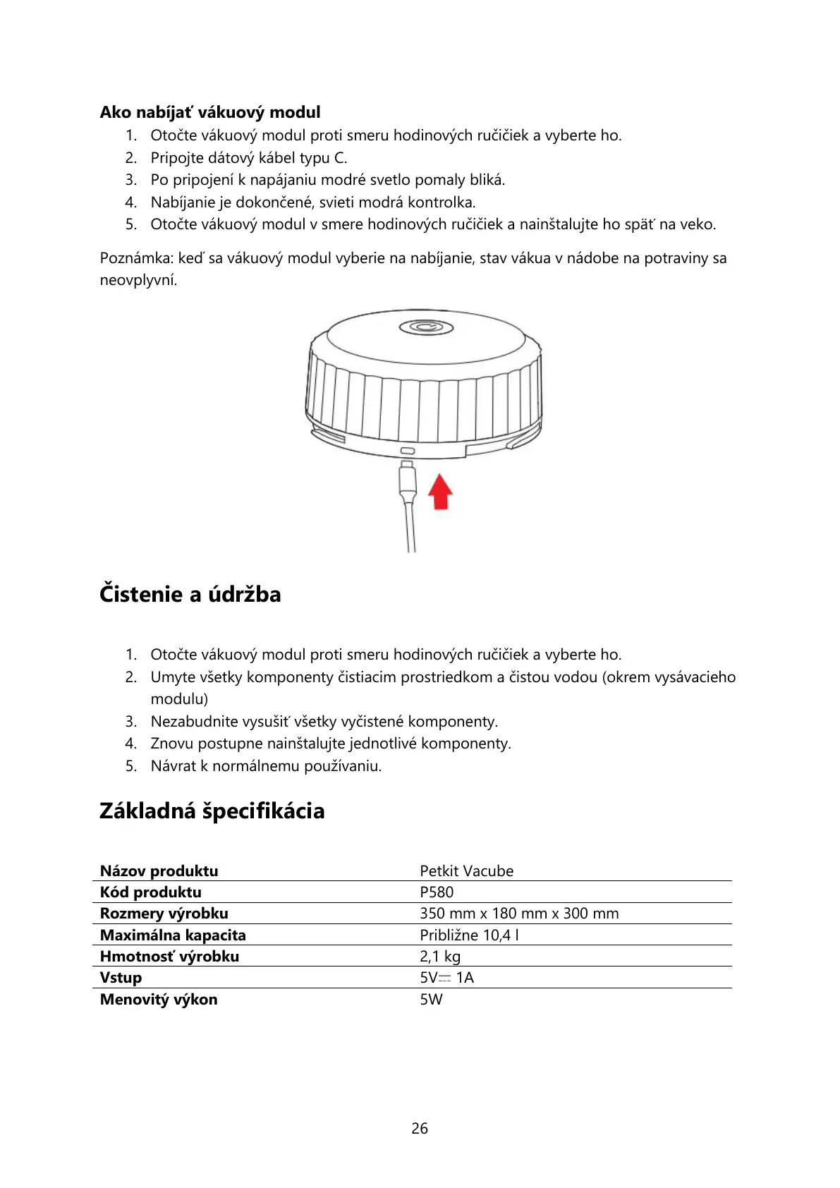 Poznámka: keď sa vákuový modul vyberie na nabíjanie, stav vákua v nádobe na potraviny sa