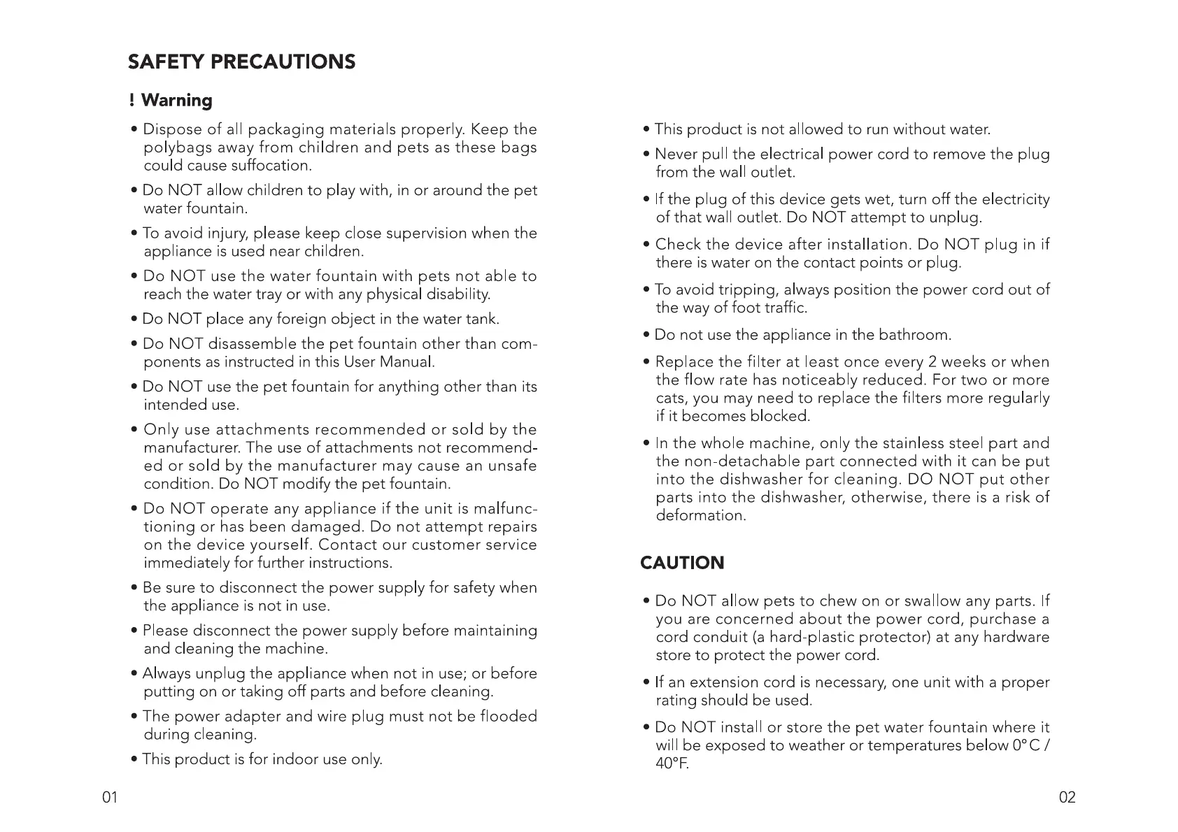 Petlibro PLWF115 - Safety Precautions; General Warnings; Electrical and Water Safety; Usage and Maintenance Precautions