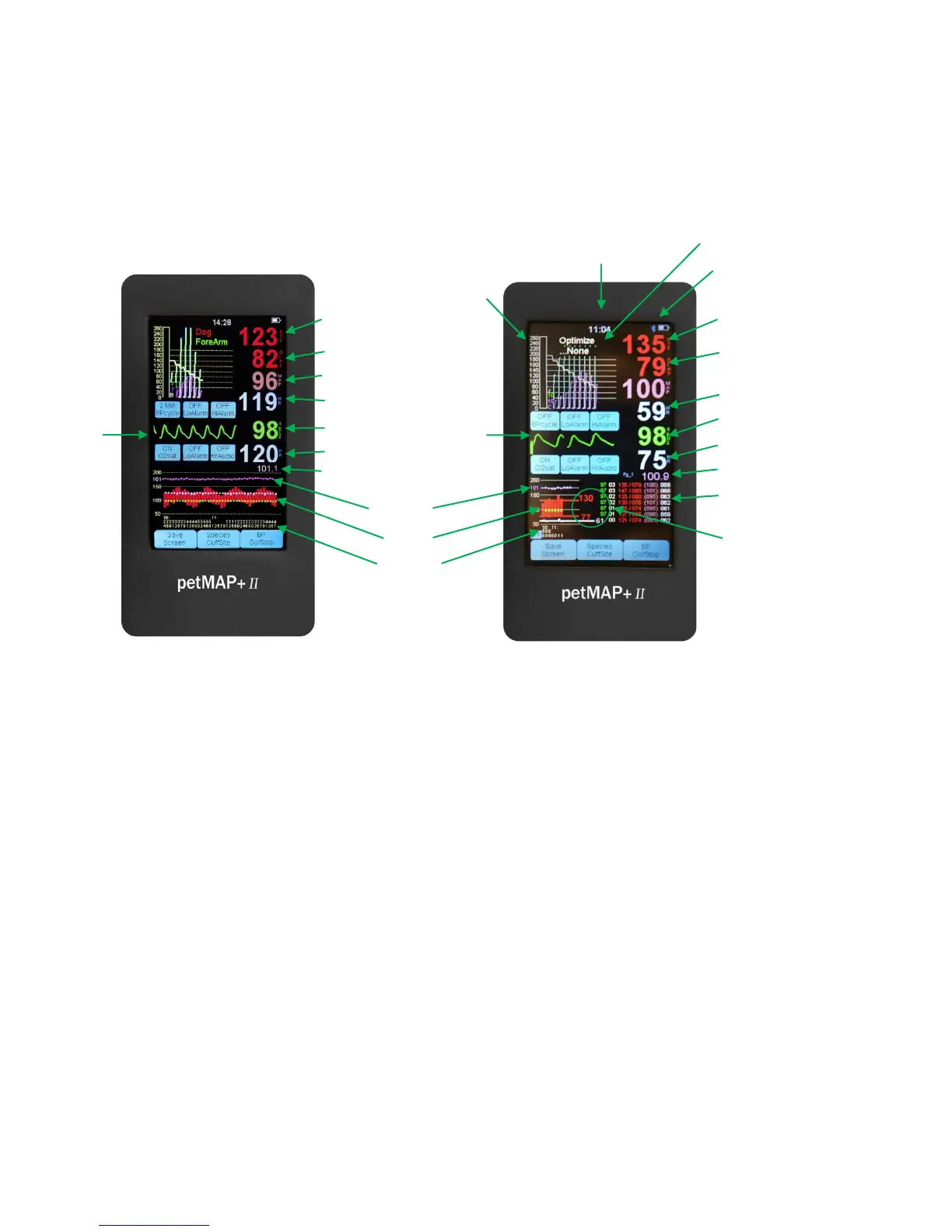 Operating Modes & Displays. Note the diagram for a description of petMAP+II display content.