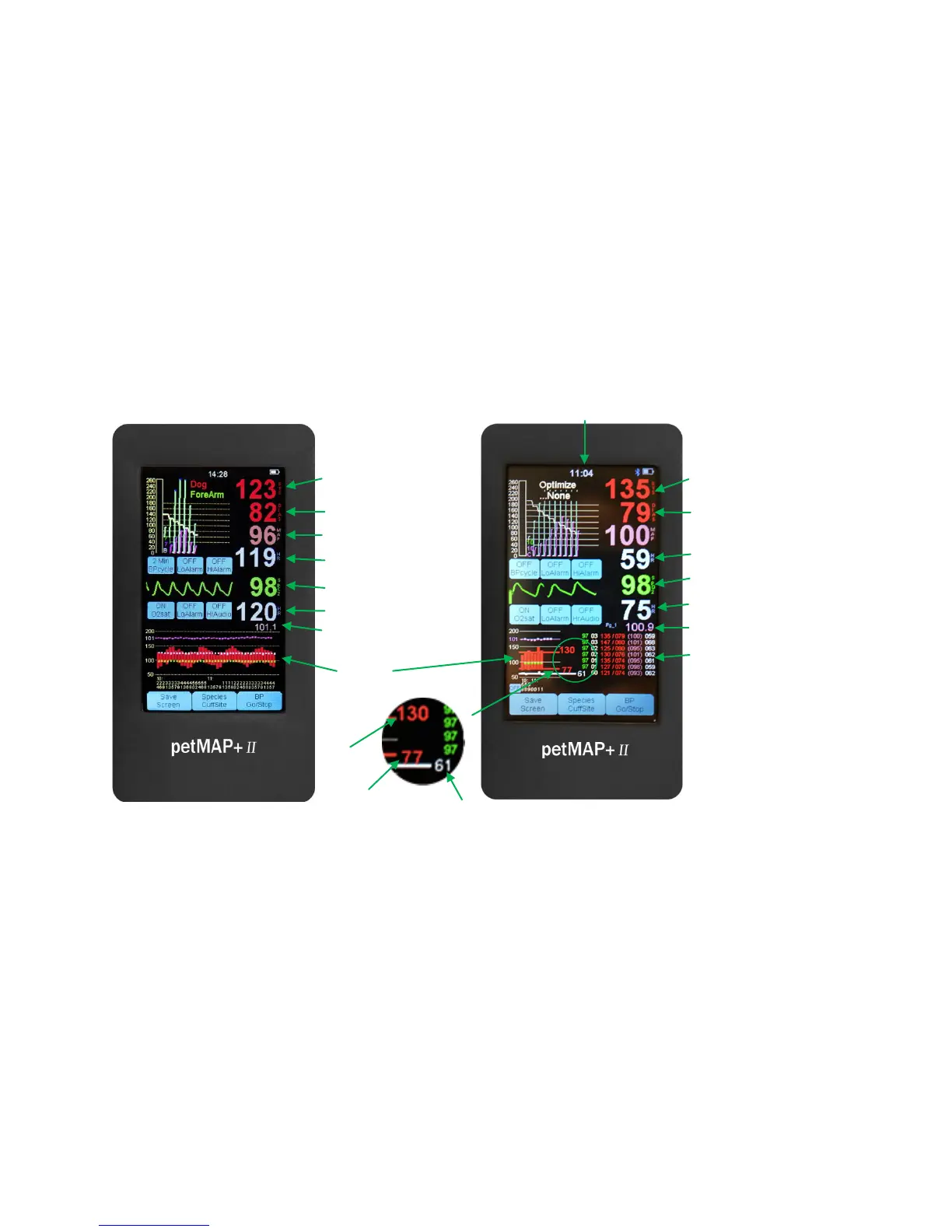 During cuff pressure deflation, petMAP+II will display the cuff pressure and the oscillometric waveform.