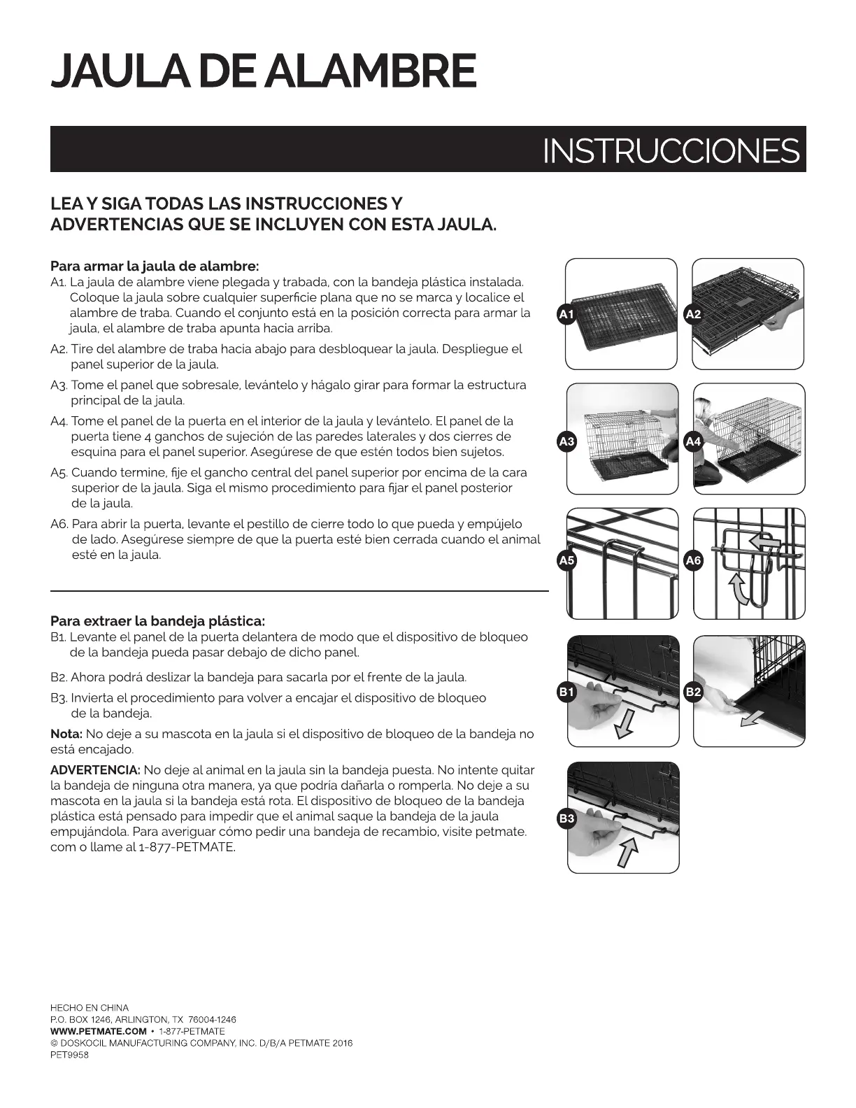 A1. La jaula de alambre viene plegada y trabada, con la bandeja plástica instalada.