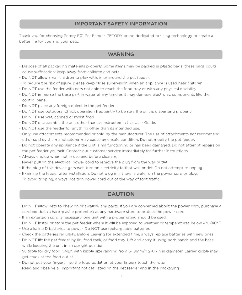 Petory F01 - Important Safety Information; Warnings; Cautions