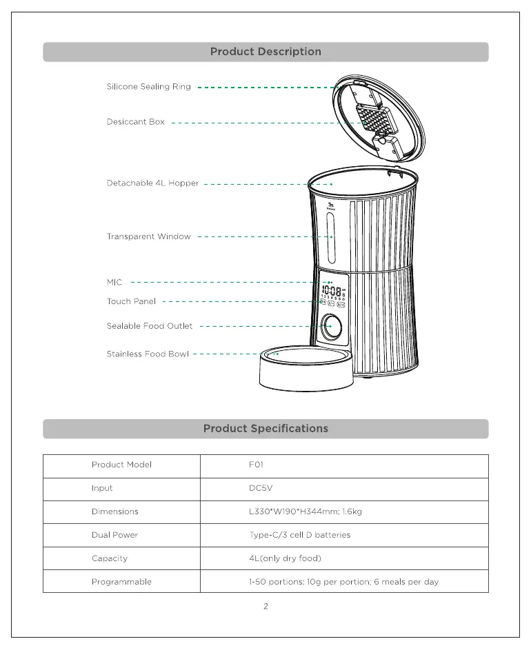 Petory F01 - Product Description; Component Identification; Product Specifications; Technical Details