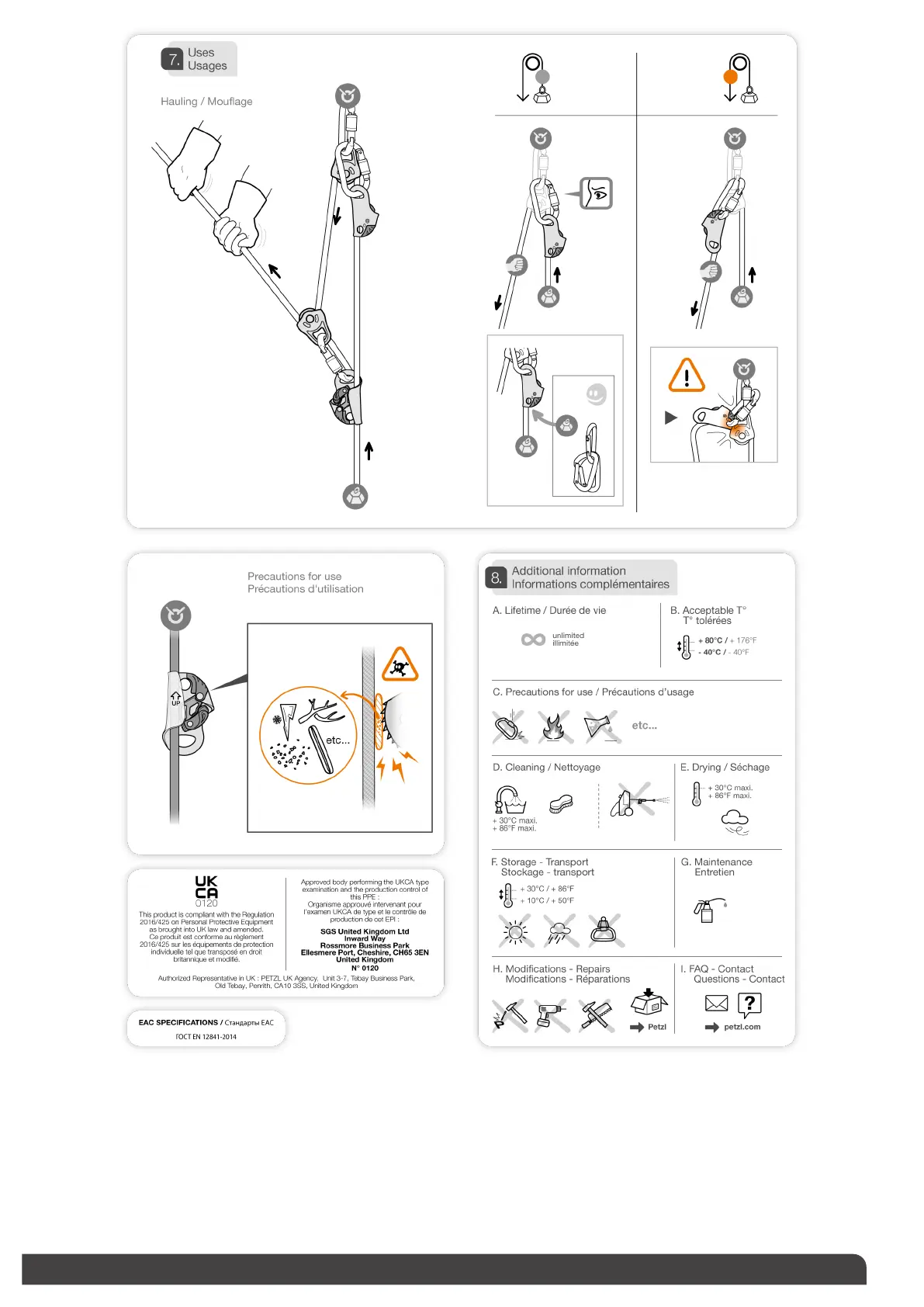 Petzl BASIC - Hauling; Mouflage; Additional information; Precautions for use; Cleaning and Drying