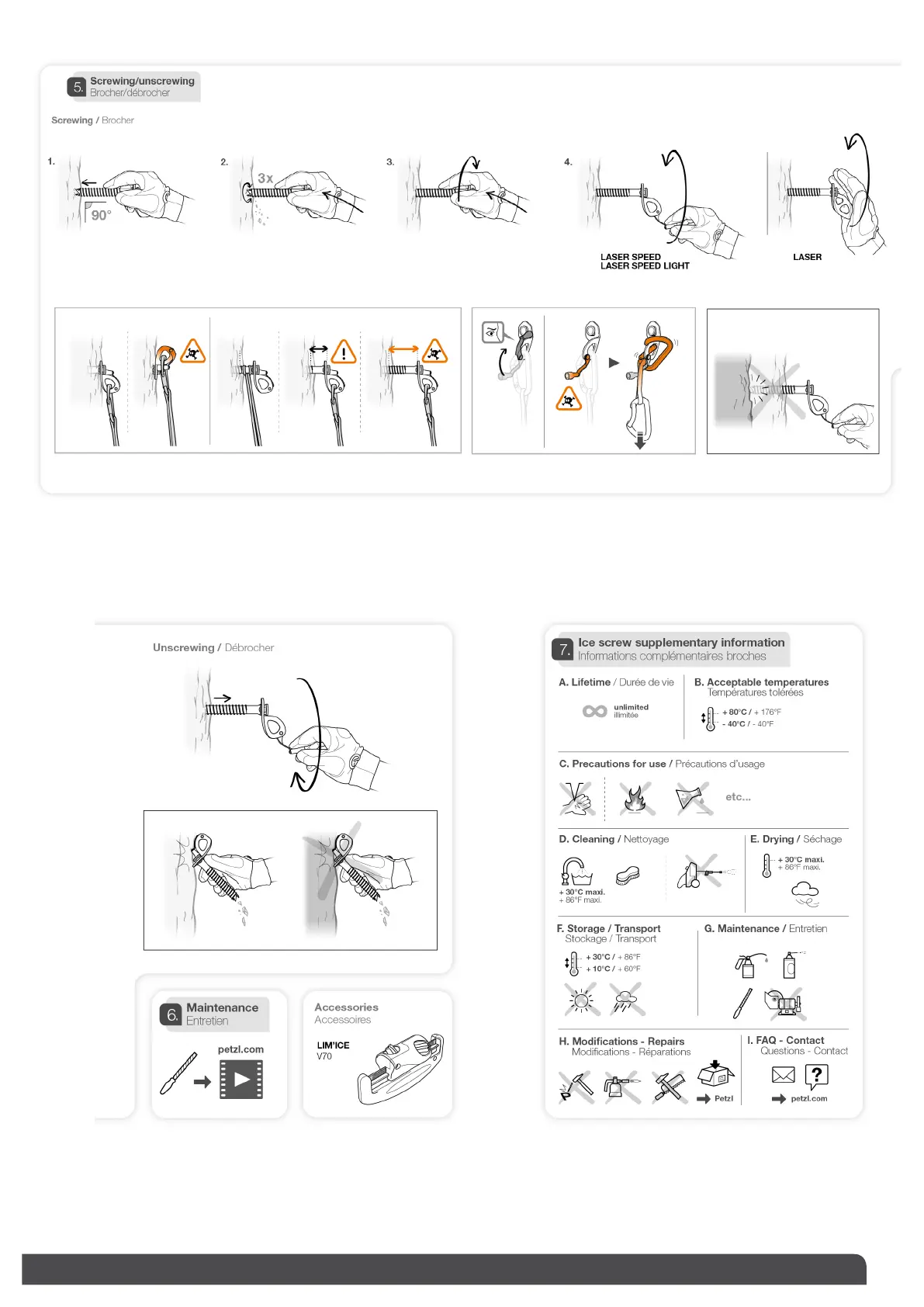 Petzl Laser - Screwing and Unscrewing Procedures; Screwing Ice Screws; Unscrewing Ice Screws; Supplementary Ice Screw Information