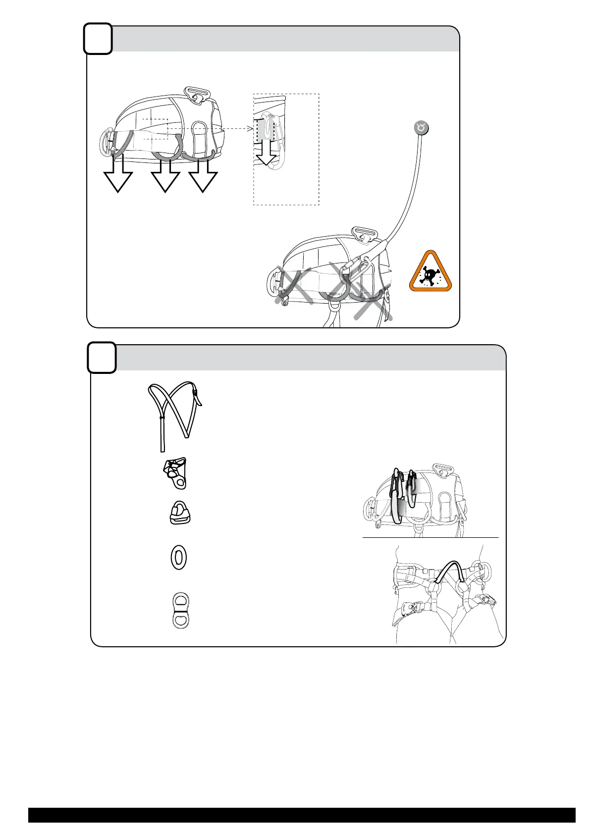 WARNING DANGER, never use equipment loops for belaying, rappelling, tying-in,