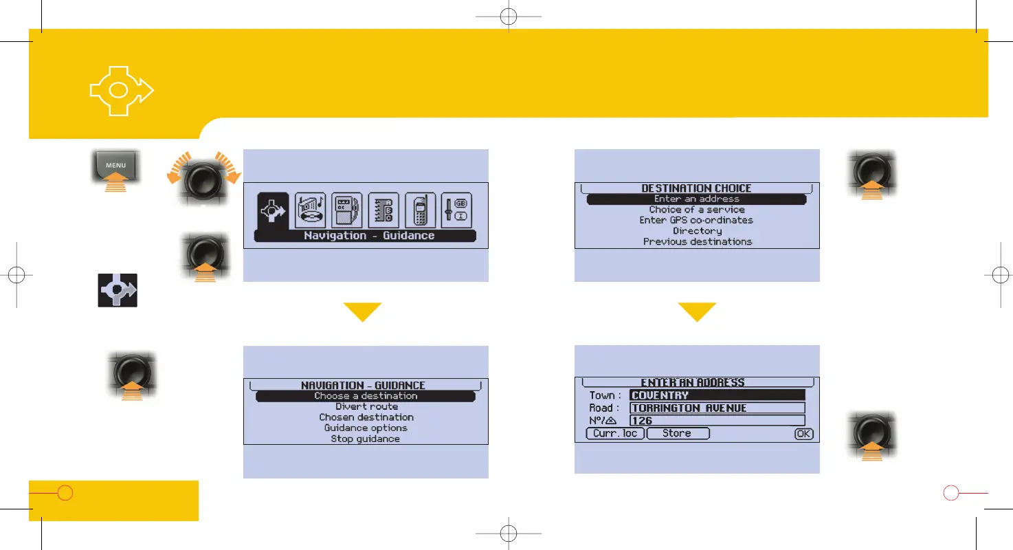 PEUGEOT RT3 - Entering New Addresses for Guidance; Selecting Navigation-Guidance from Main Menu; Choosing Destination and Inputting Address; Activating Guidance After Entry
