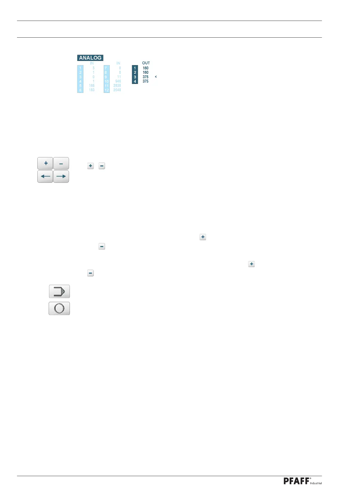 The values of the selected analog outputs are increased with the key and decreased with