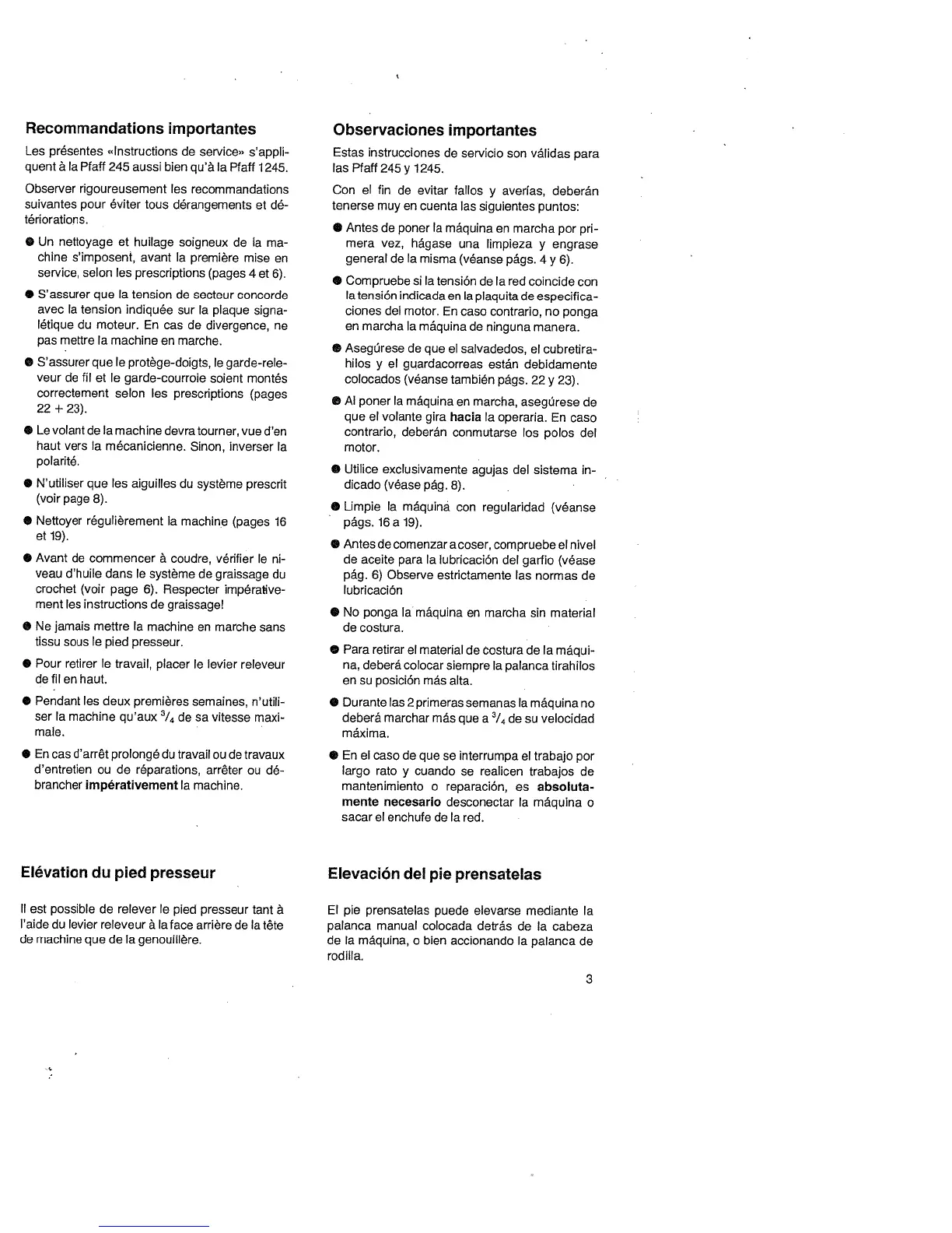 Pfaff 245 - Recommandations Importantes; Observaciones Importantes; Elevación del Pie Prensatelas