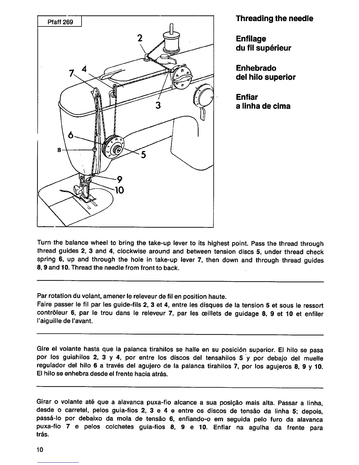 regulador del hilo 6 a traves del agujero de la palanca tirahilos 7, por los agujeros 8, 9 y 10.