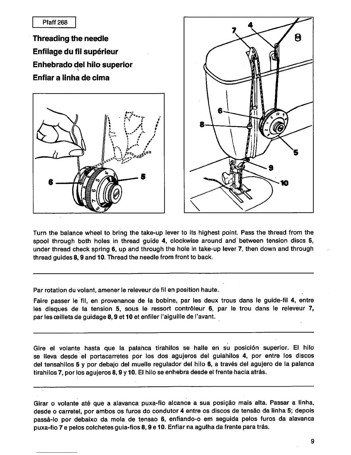 del tensahilos 5 y por debajo del muelle regulador del hilo 6, a trav§s del agujero de la palanca