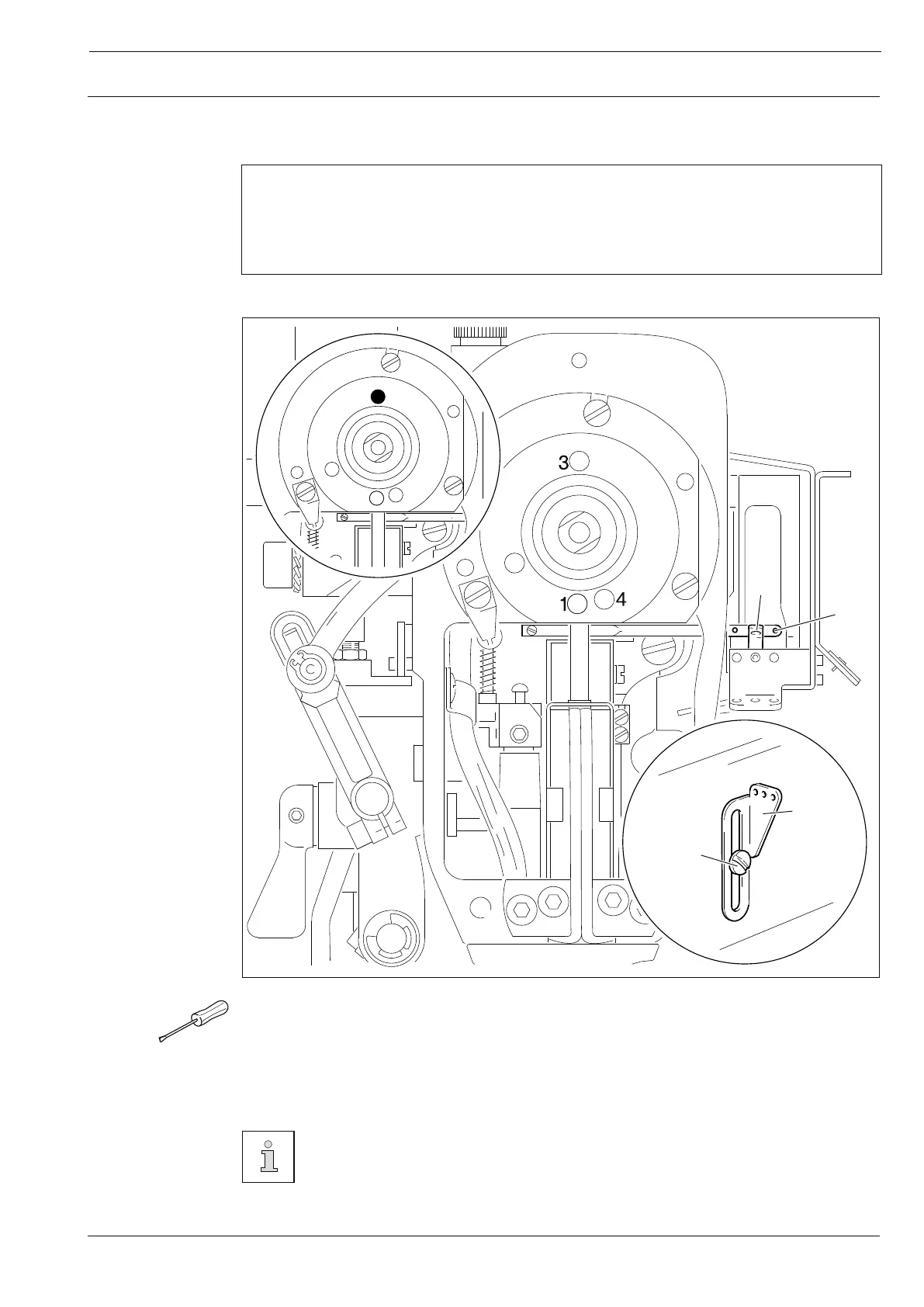 1. With the needle bar at its BDC (hole 3), the eye of the needle thread regulator 1 must be