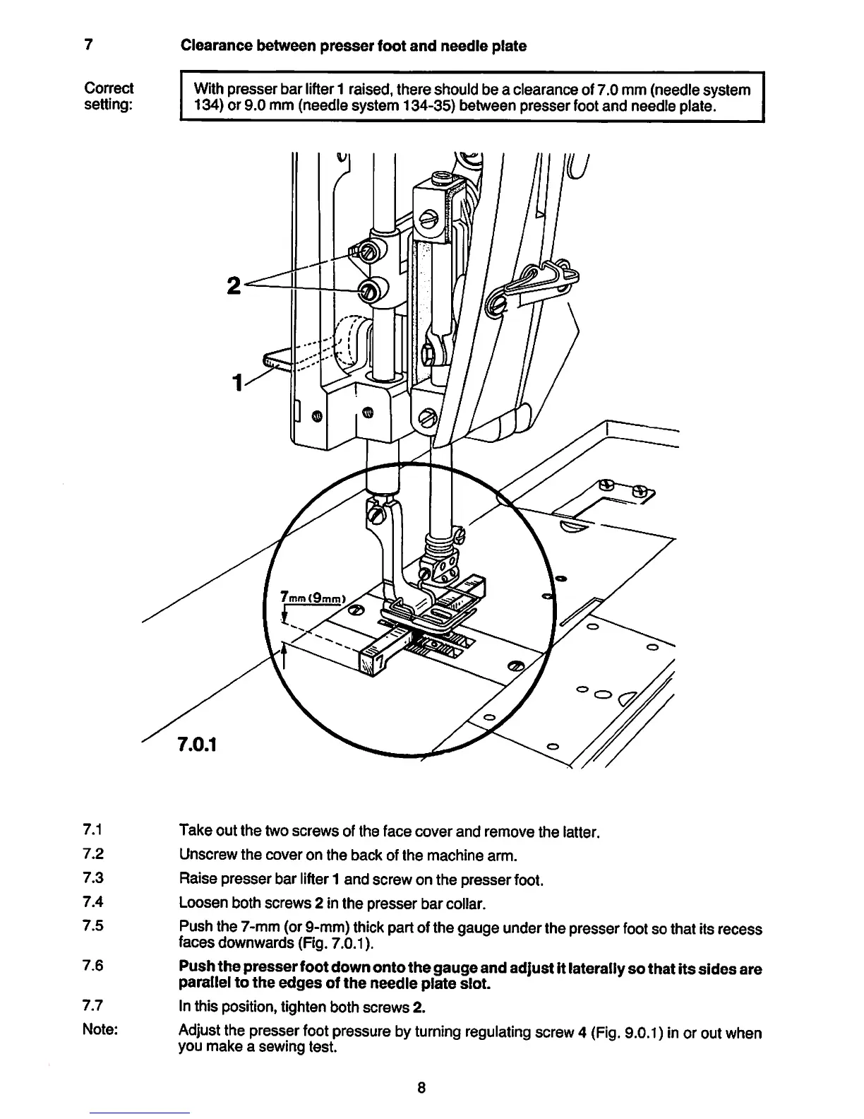 Withpresser bar lifter1 raised, there shouid be a ciearanceof7.0 mm (needie system