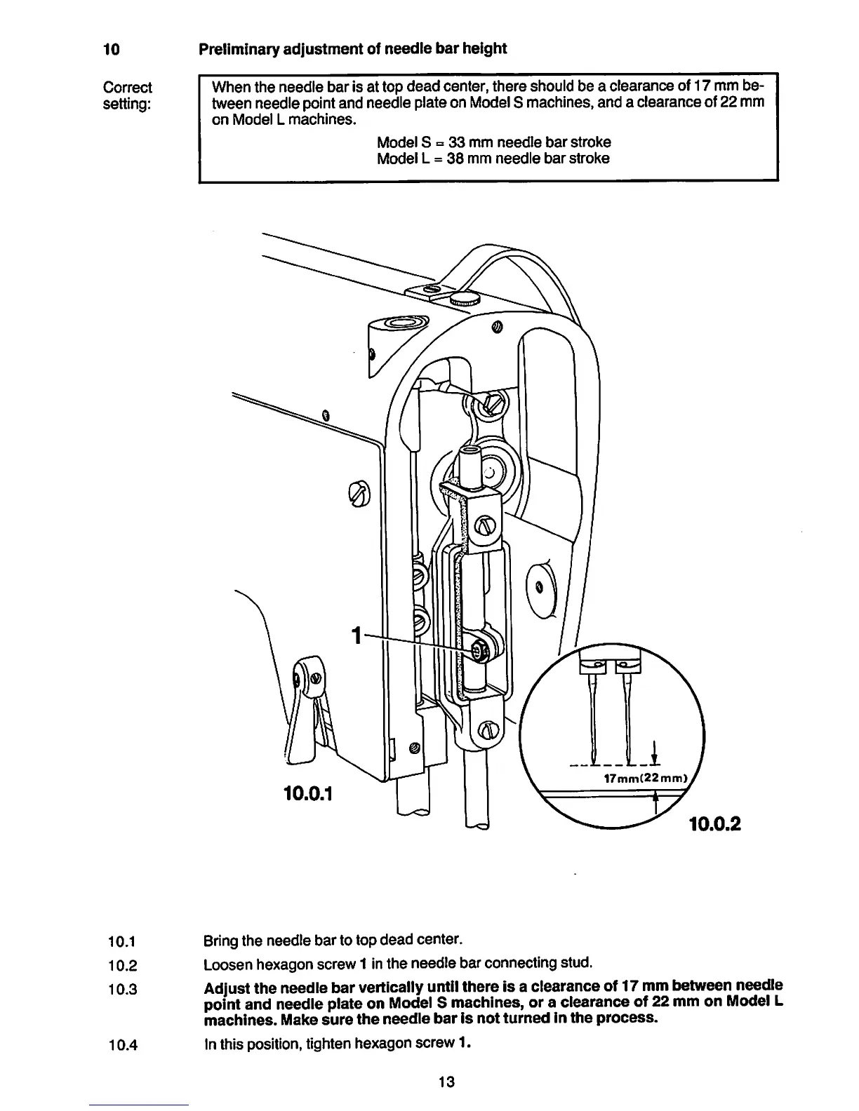 10.2 Loosen hexagon screw 1 inthe needle bar connecting stud.