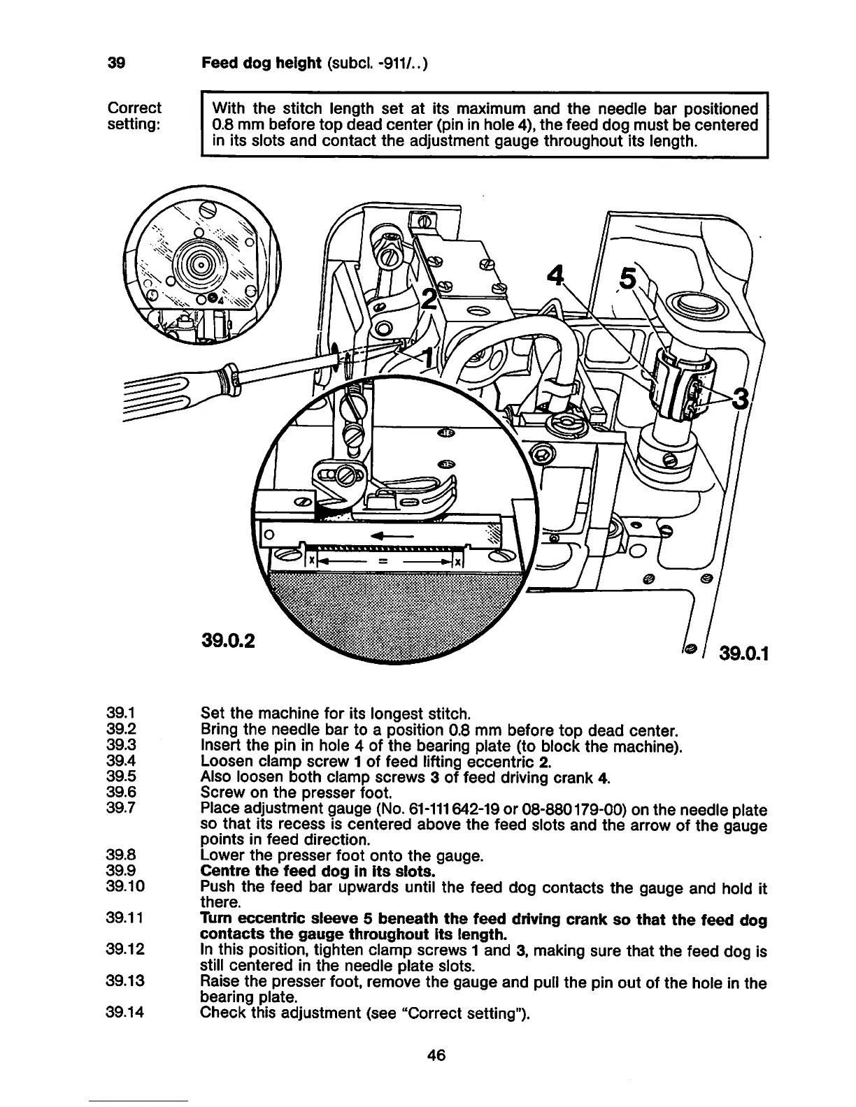 39.12 In this position, tighten clamp screws 1 and 3, making sure that the feed dog is