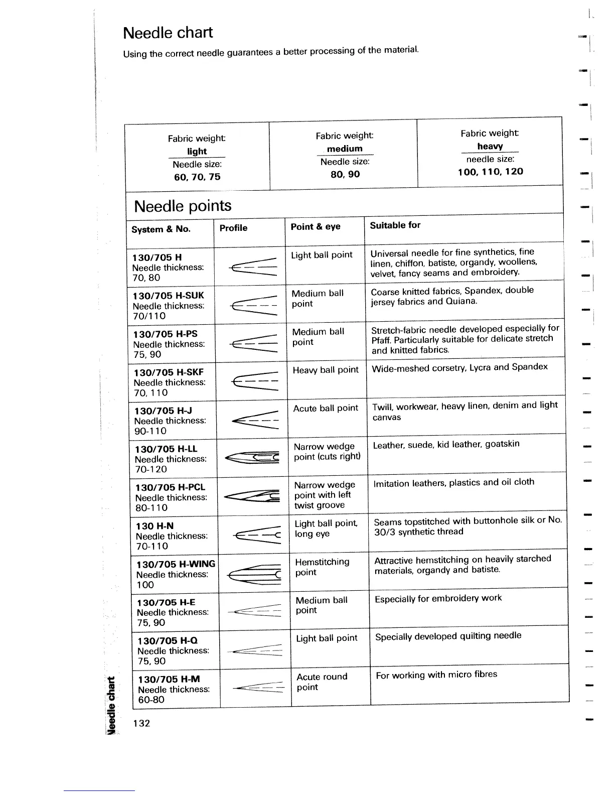 Pfaff Creative 7510 A - Needle Chart; Needle Selection by Fabric Weight; Needle Points and Suitability
