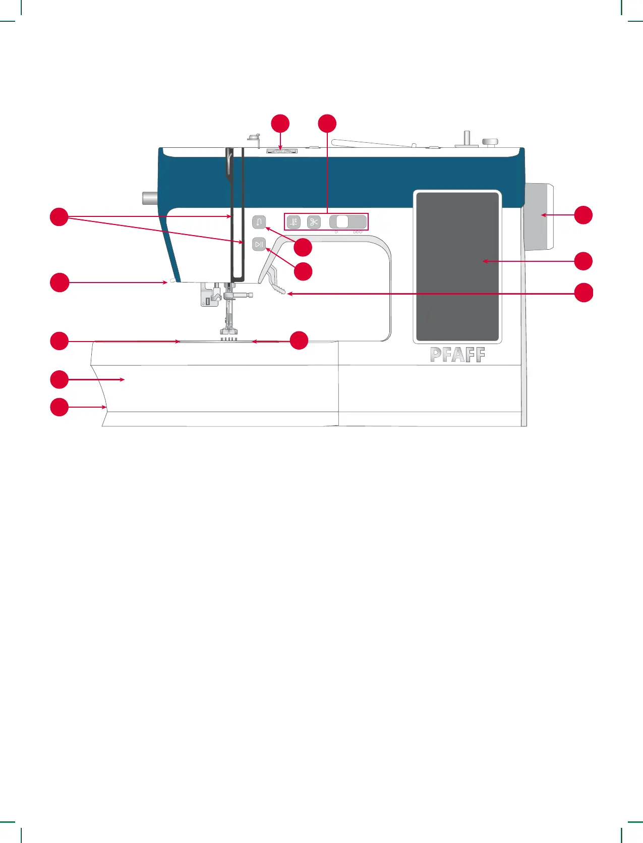 8. Start/Stop Button — Press to start and stop sew-