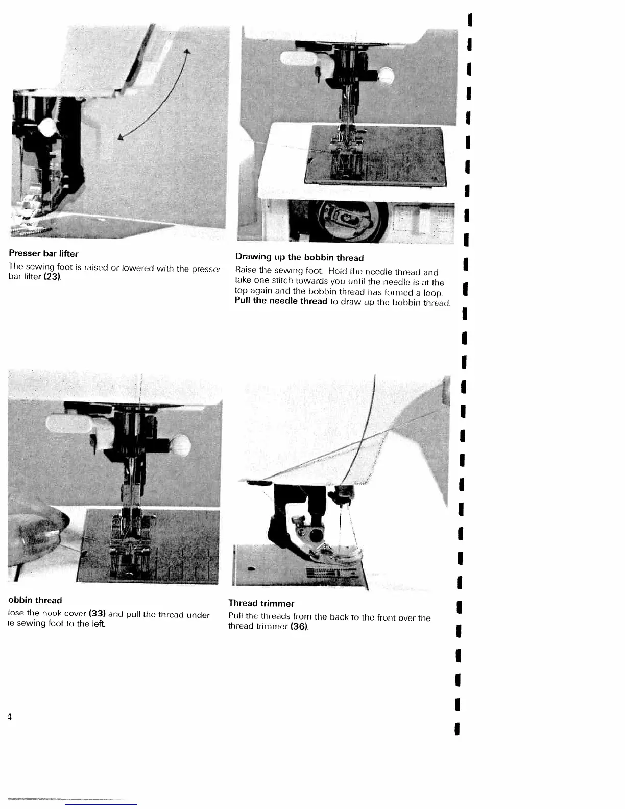 Pfaff electronic 6250 - Presser Bar Lifter; Drawing up the Bobbin Thread; Bobbin Thread; Thread Trimmer