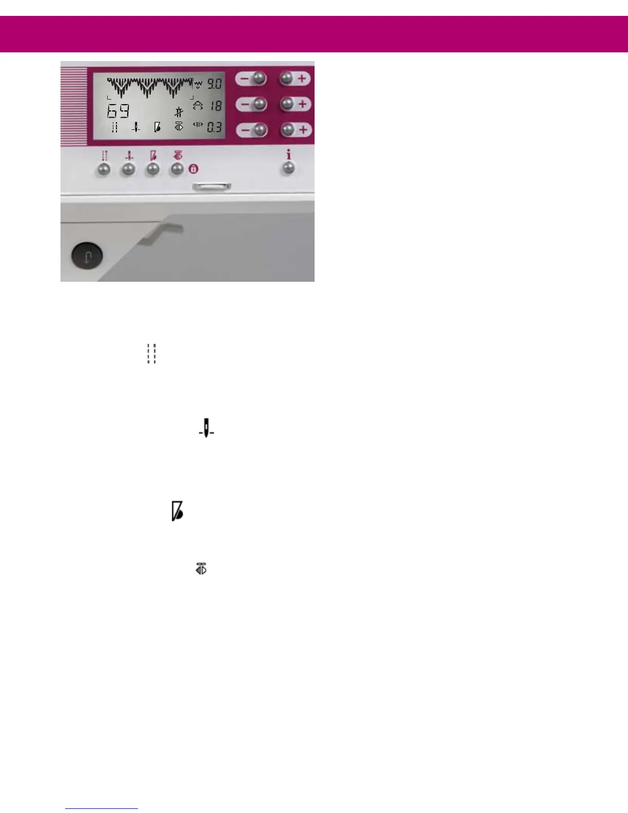 from the fabric, press the ”needle up/down” button. The needle lifts out of the fabric, and the symbol disappears from the