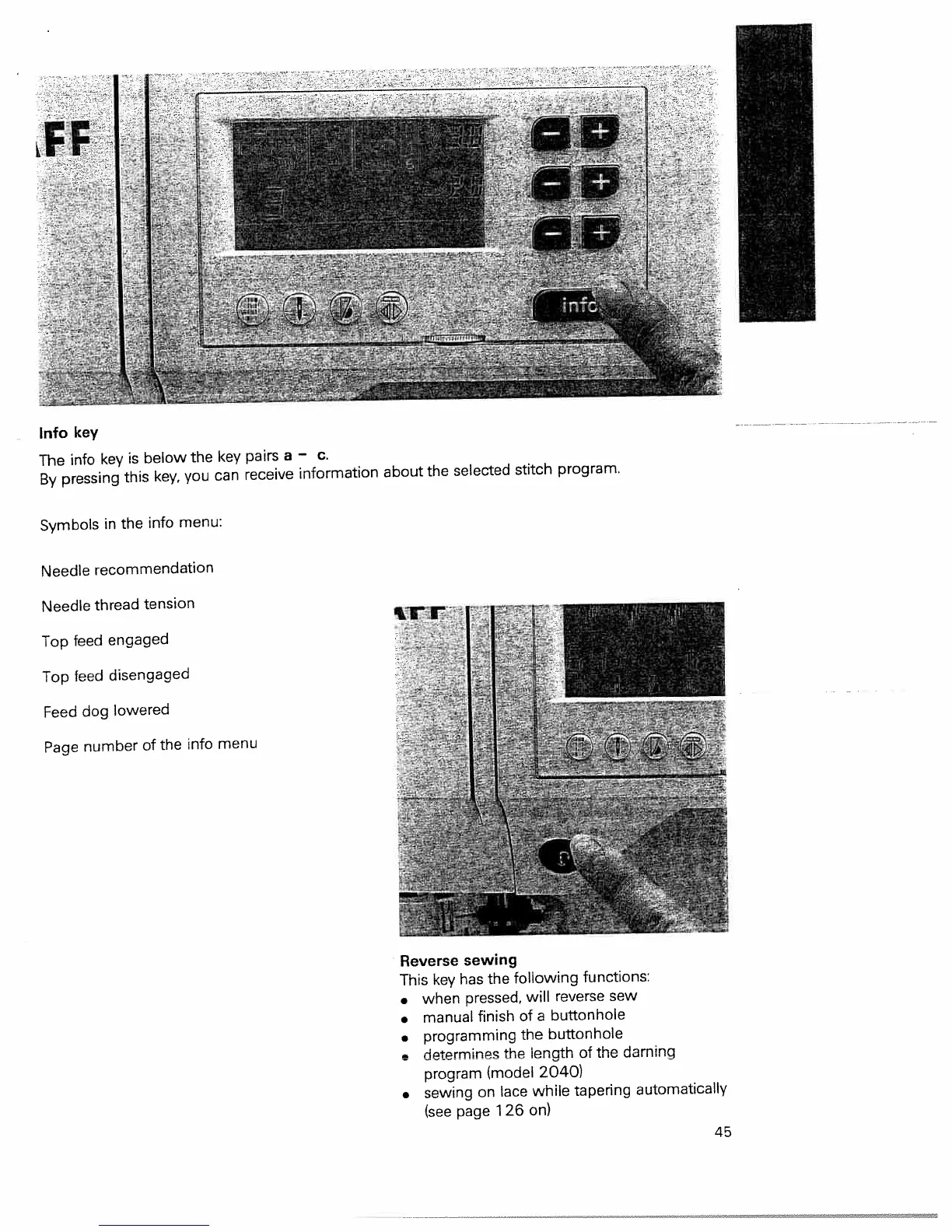 Pfaff tiptronic 2040 - Sewing Function Keys; Reverse Sewing and Info Key Usage