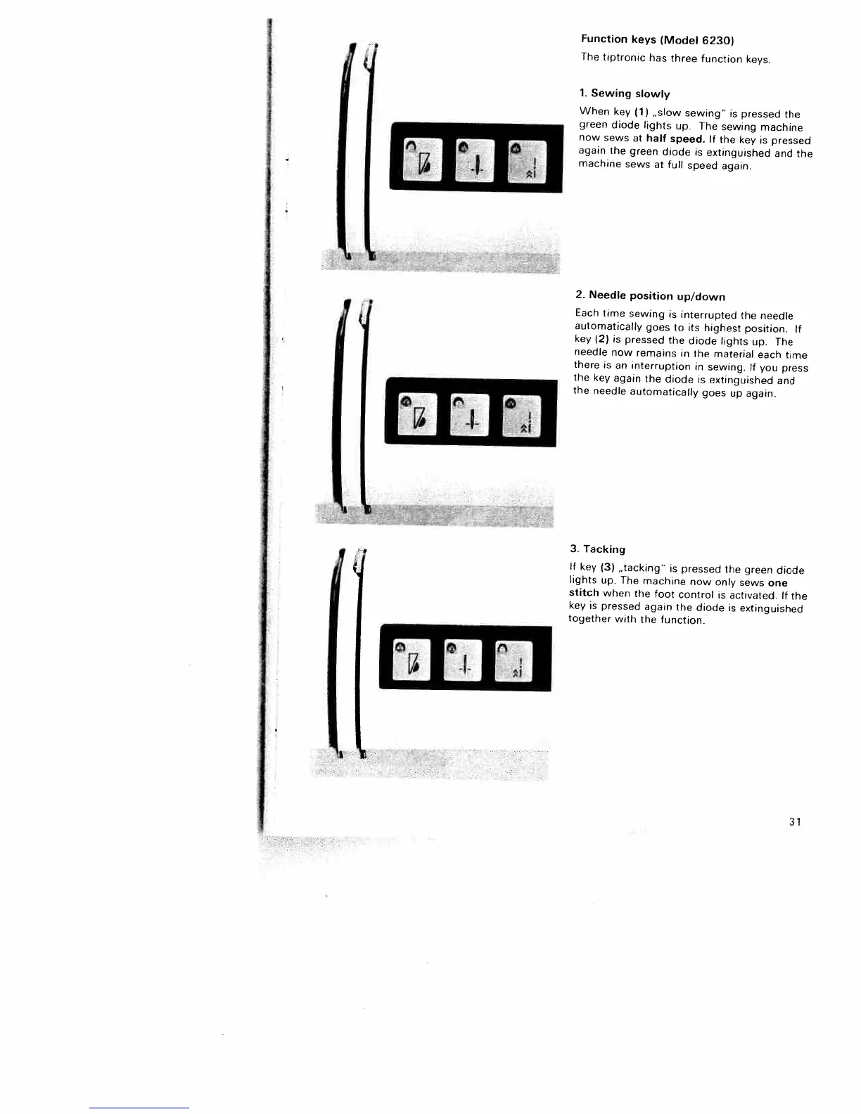 Pfaff Tiptronic 6230 - Function Keys for Special Operations; Sewing Slowly, Needle Position, and Tacking