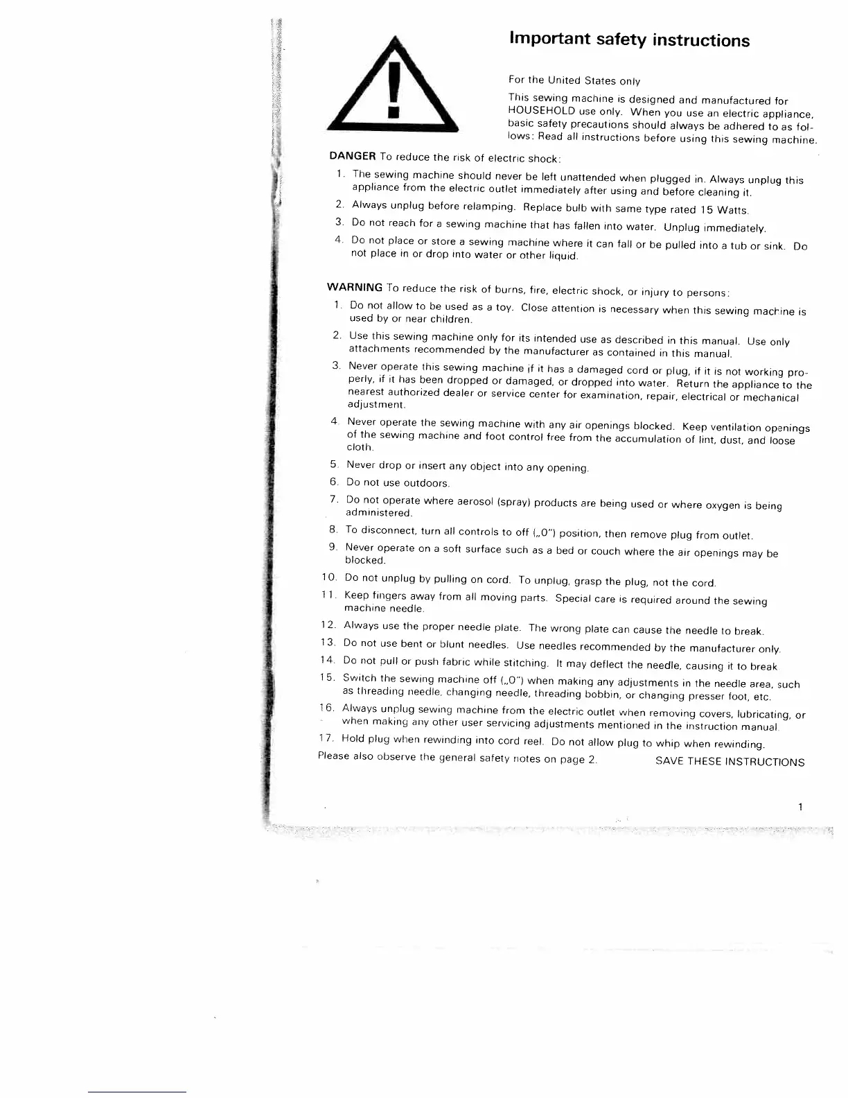 Pfaff Tiptronic 6230 - General Safety Instructions for Electric Sewing Machines; Household Use Precautions and Warnings