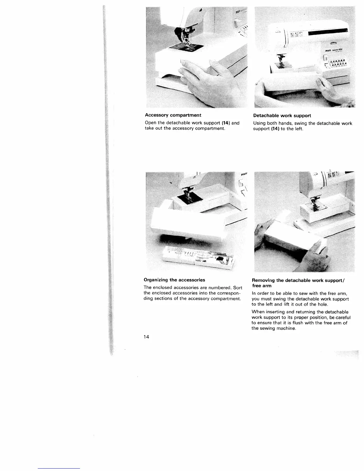 Pfaff tiptronic 6232 - Organizing the Accessories; Removing the Detachable Work Support;Free Arm; Detachable Work Support; Accessory Compartment