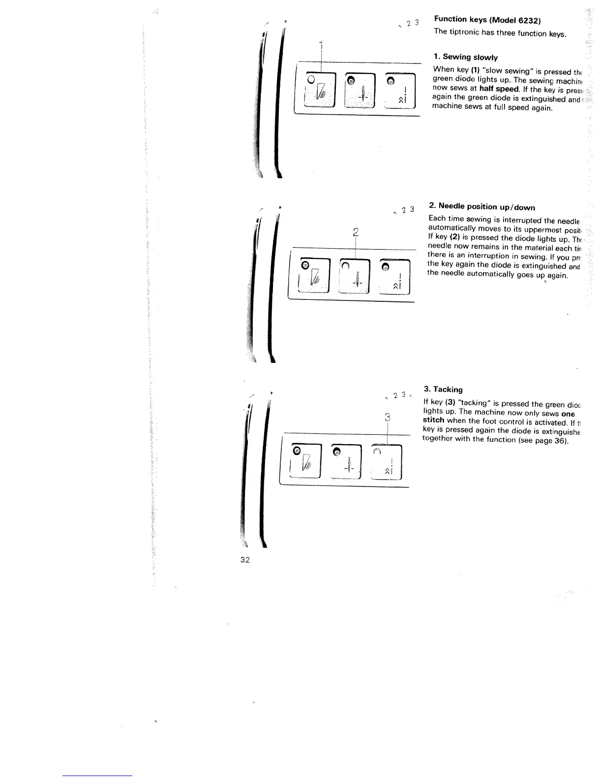 Pfaff tiptronic 6232 - Fuction Keys; Sewing Slowly; Needle Position Up;Down; Tacking