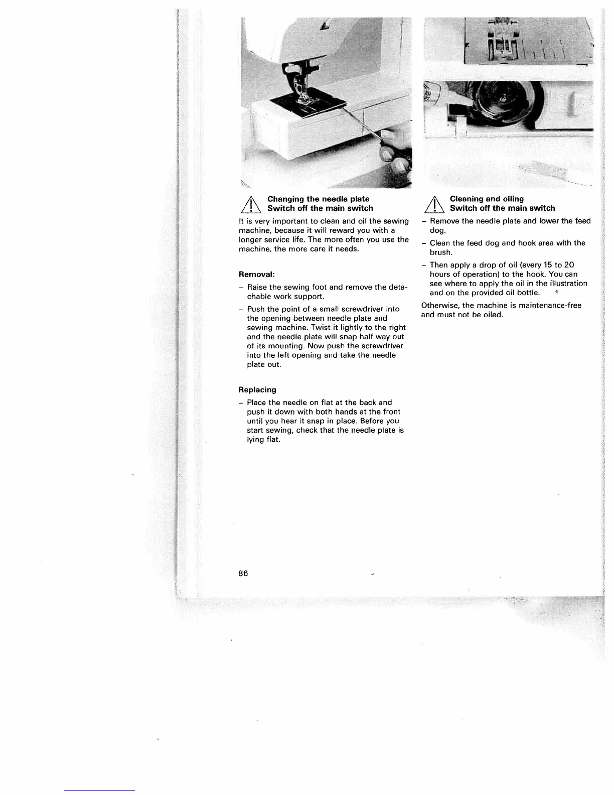 Pfaff tiptronic 6232 - Changing the Needle Plate; Cleaning and Oiling