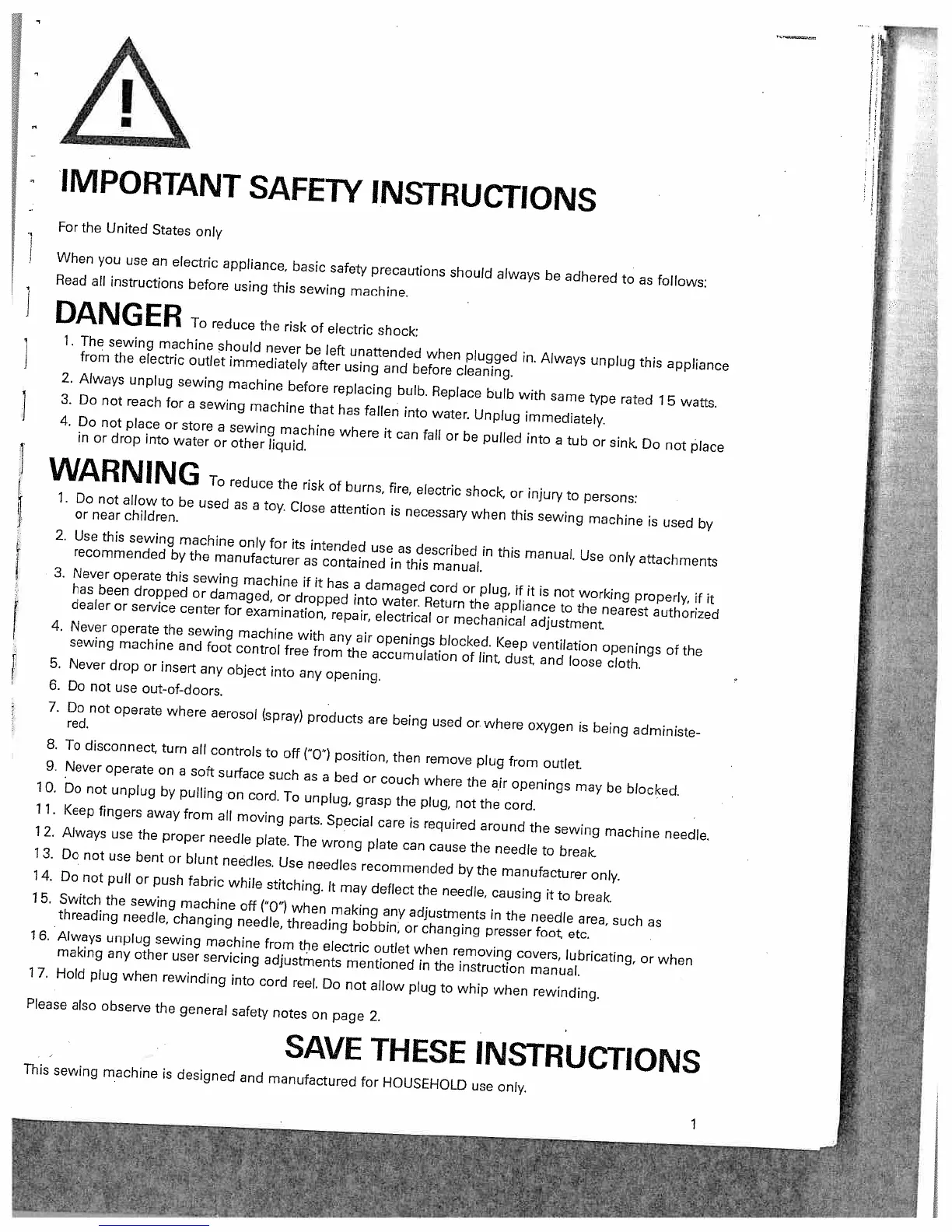 Pfaff tiptronic 6270 - Important Safety Instructions; Electrical Shock Prevention; General Safety Warnings