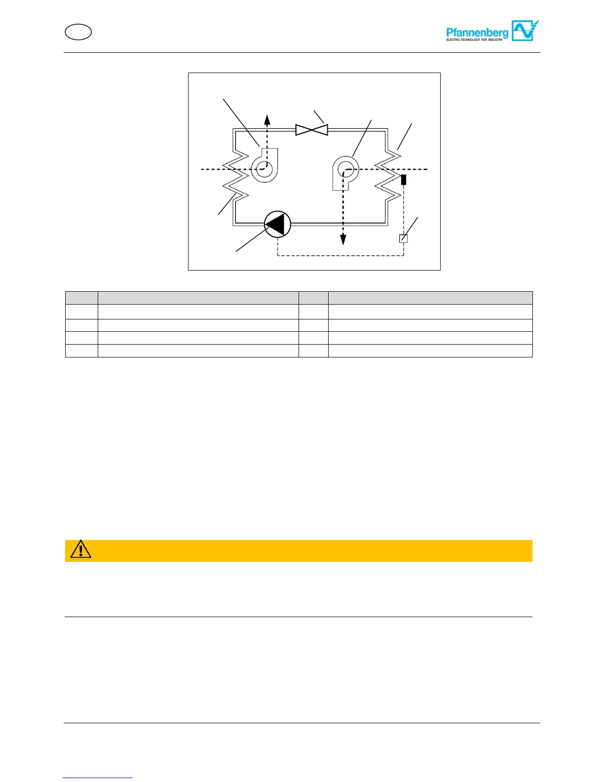 The evaporator fan (internal) (6) draws the air inside the switch cabinet through the evaporator (4) and releases