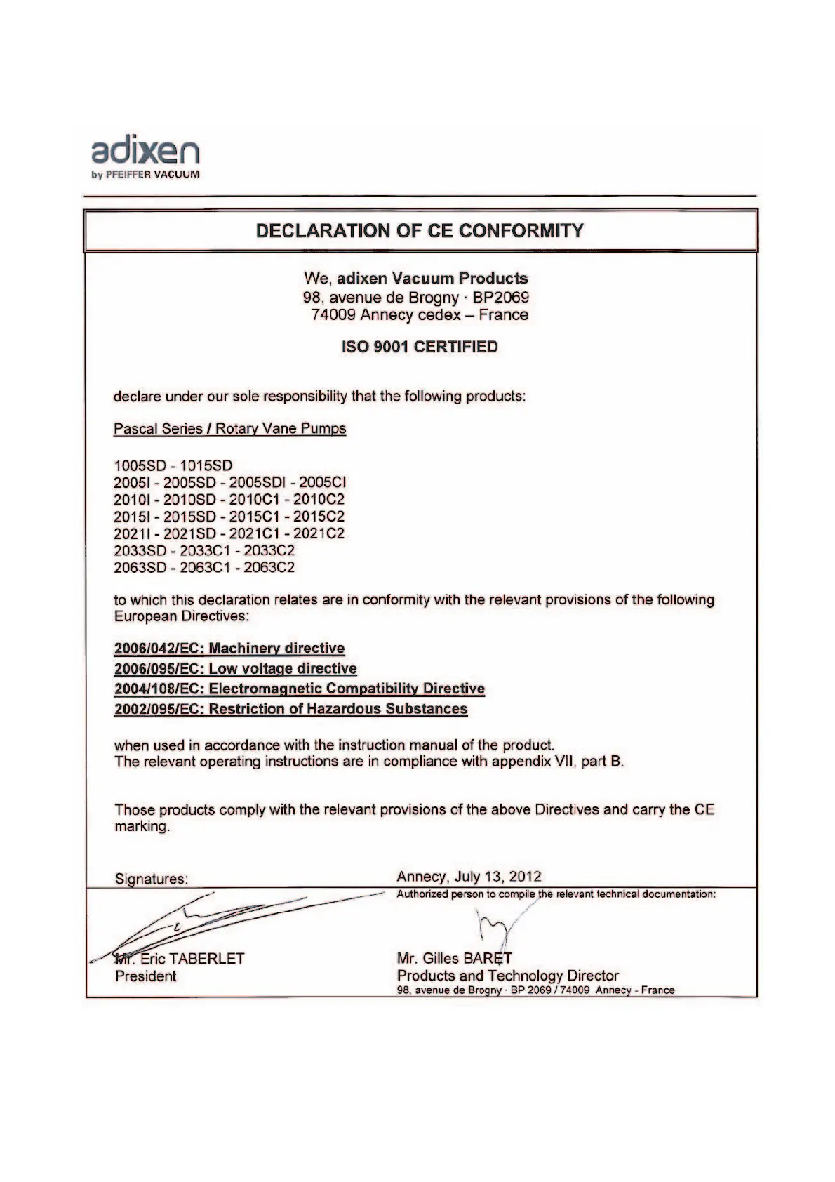 Pfeiffer Vacuum Pascal 2033 SD - Declaration of Conformity