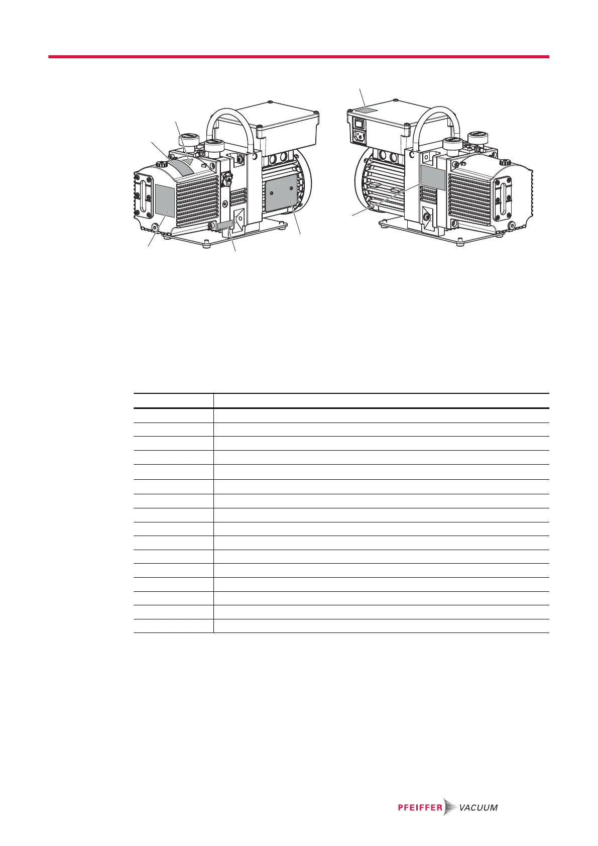 1 Sticker for pre-set motor voltage 5 Rating plate of the rotary vane vacuum pump