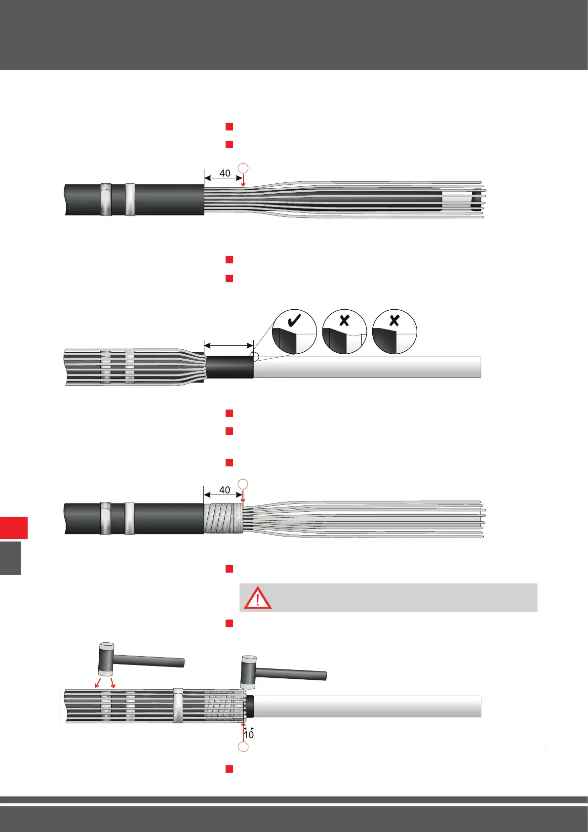 Remove outer jacket to 40 mm behind the „jacket cut“ (1).