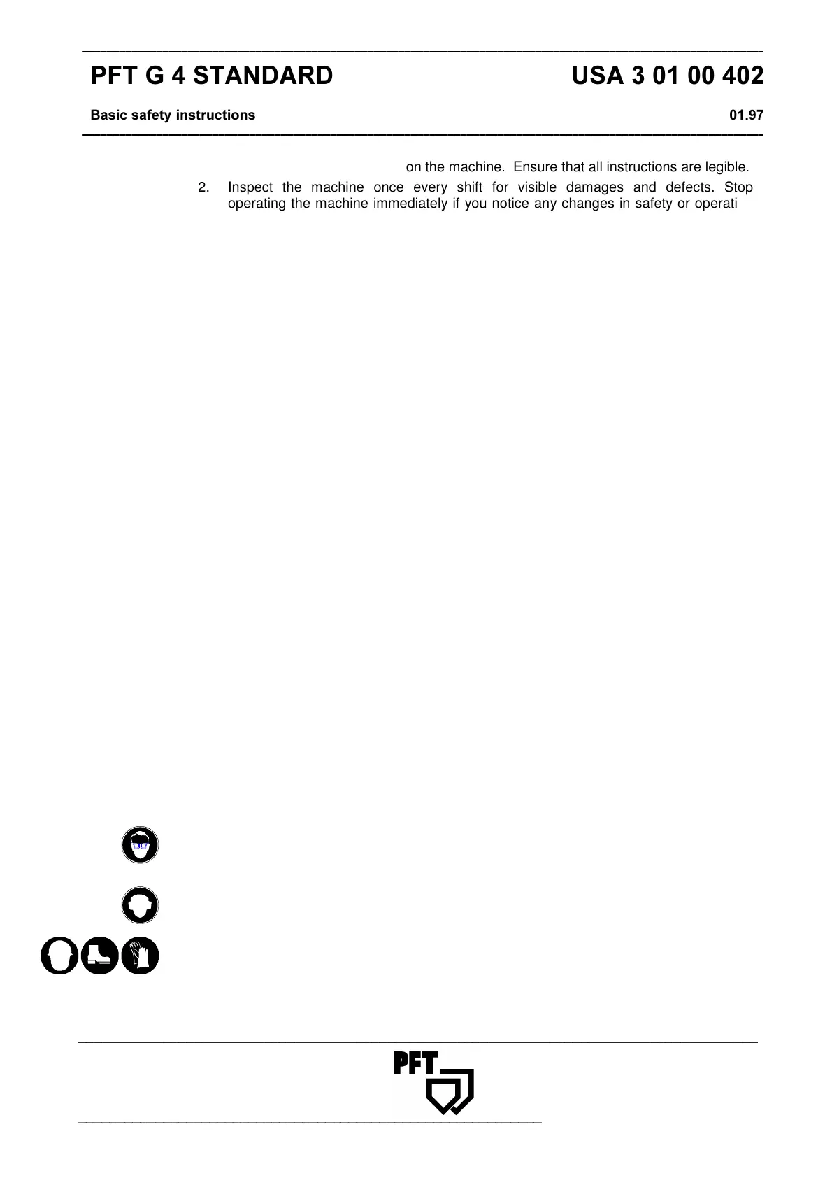 2. Inspect the machine once every shift for visible damages and defects. Stop