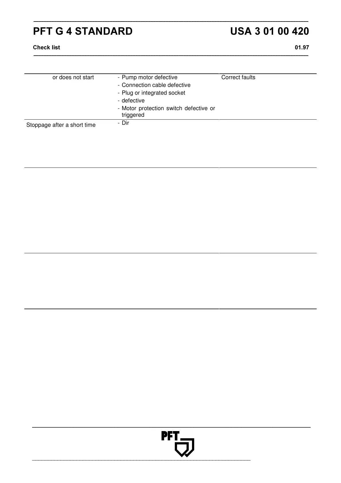 Pump motor does not start - Pump motor defective Correct faults