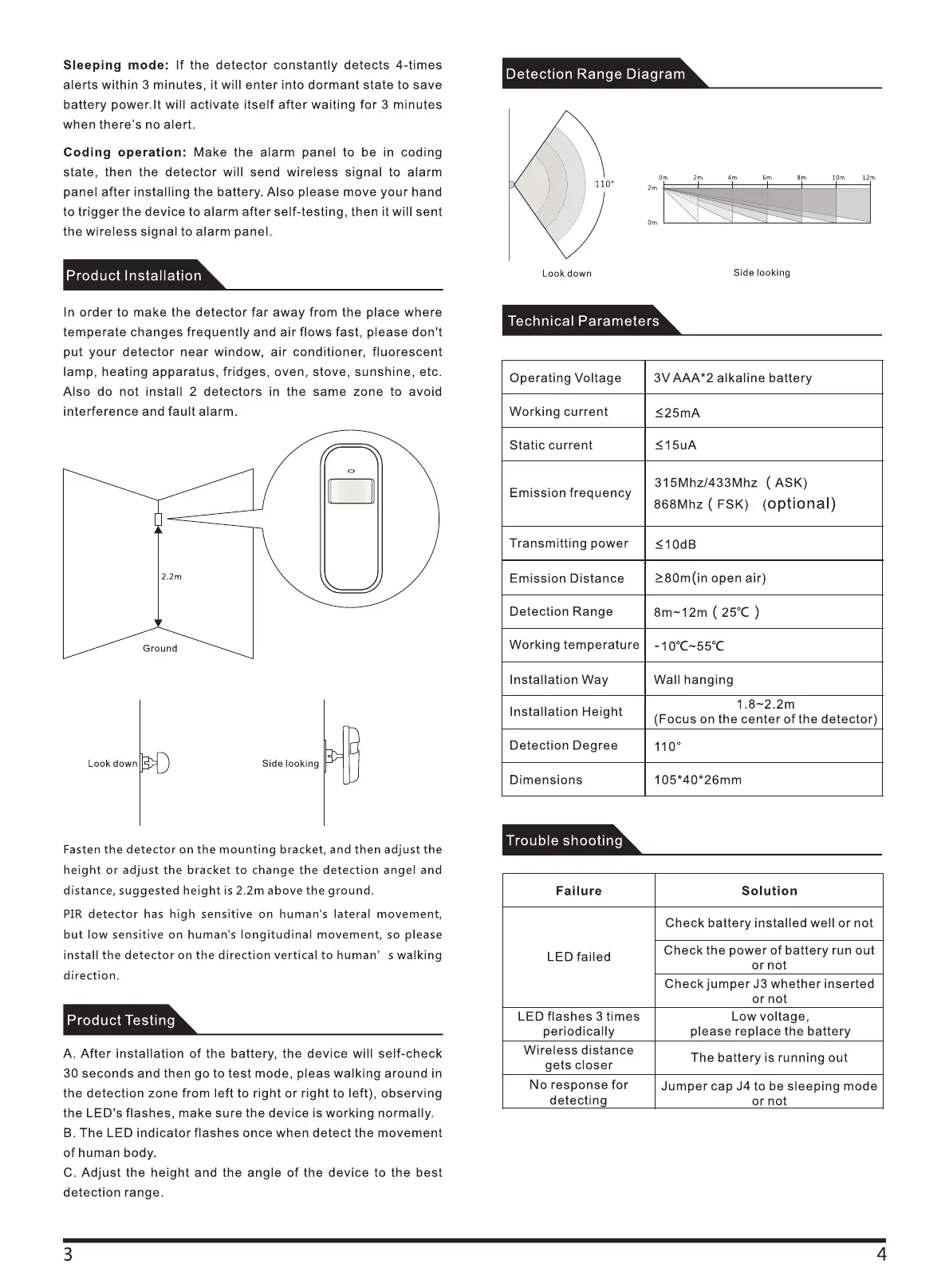 PGST PA-92R - Sleeping Mode Operation; Coding Operation; Product Installation and Technical Details; Product Installation Guidelines