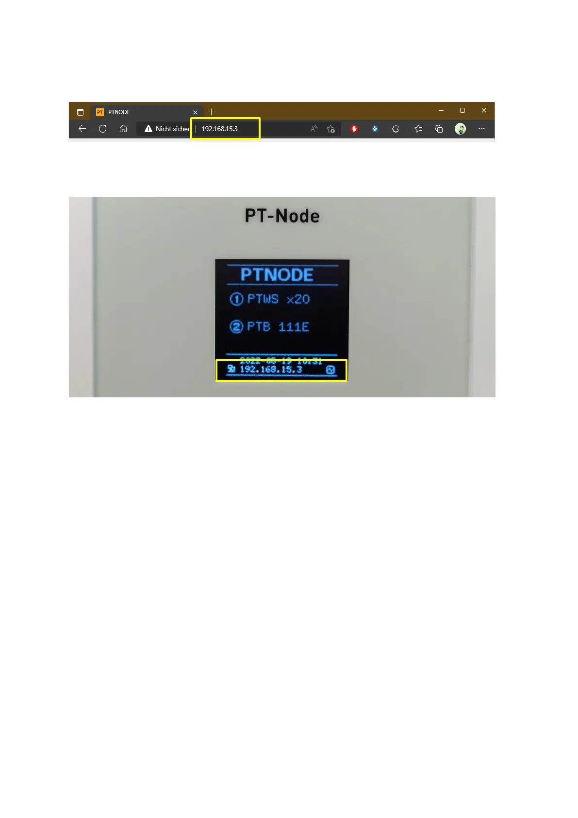 The current IP address of PT-Node is shown on the bottom of its display, alternating with