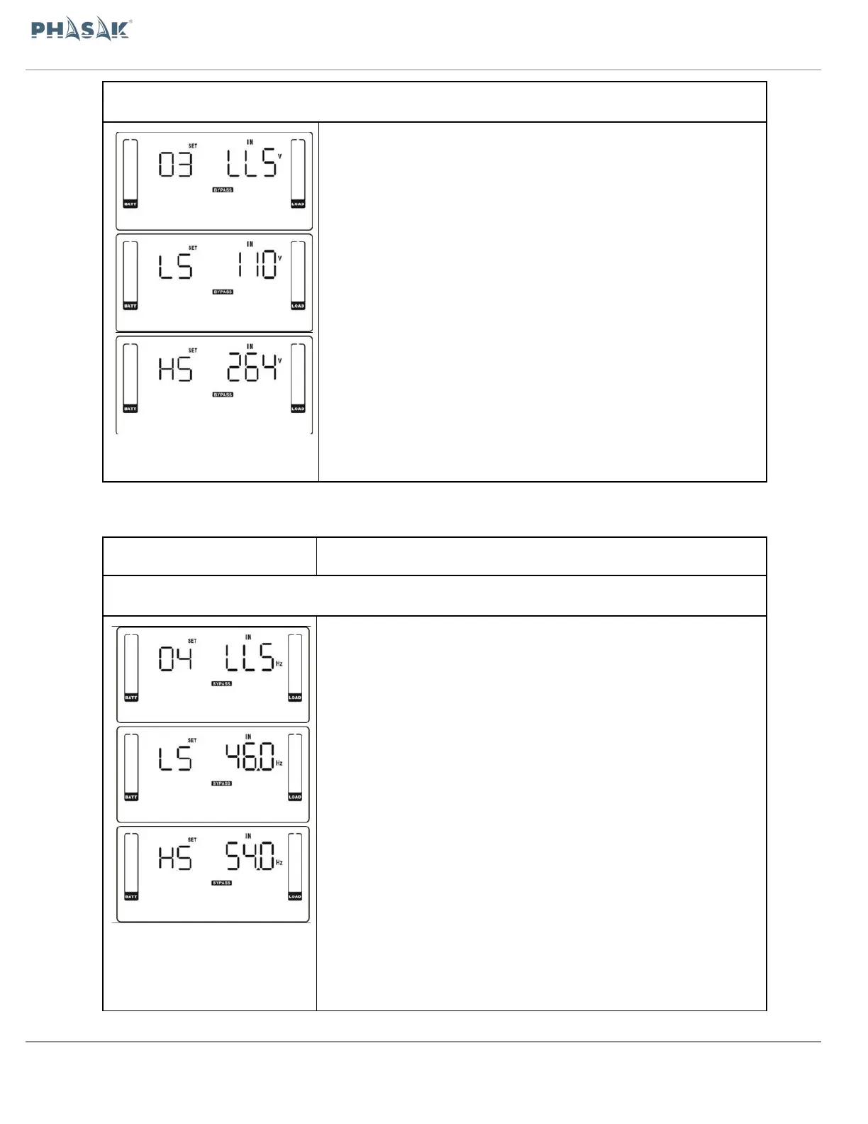 LS: Establezca la tensión baja aceptable para el bypass. El rango de