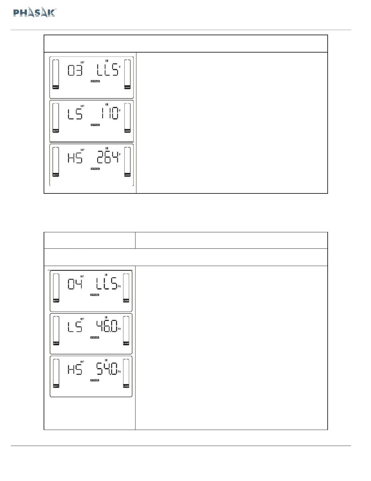 LS: Defina a baixa tensão aceitável para o bypass. O intervalo de configuração é de