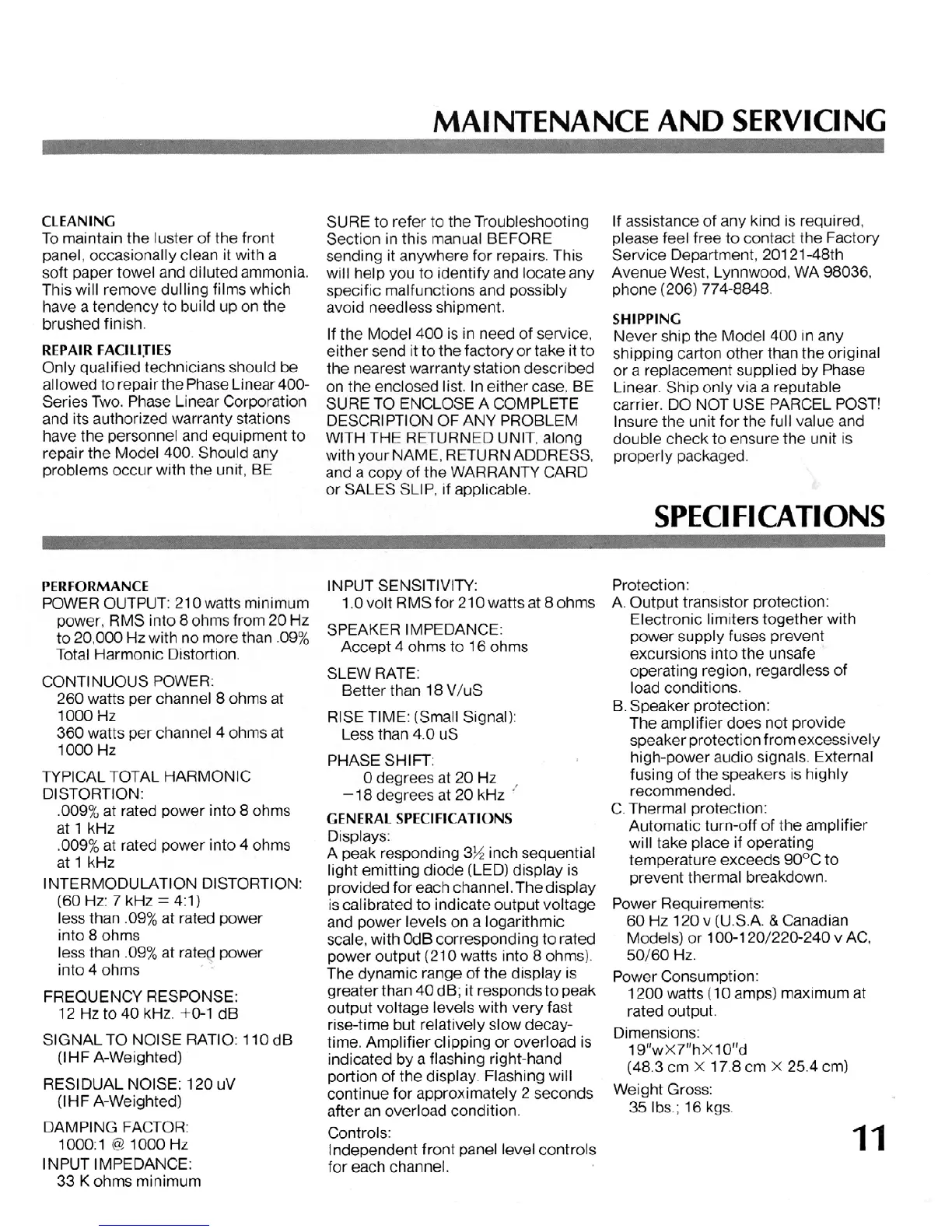 Phase Linear 400 - Maintenance and Servicing; Cleaning Procedures; Repair Facilities and Shipping; Specifications