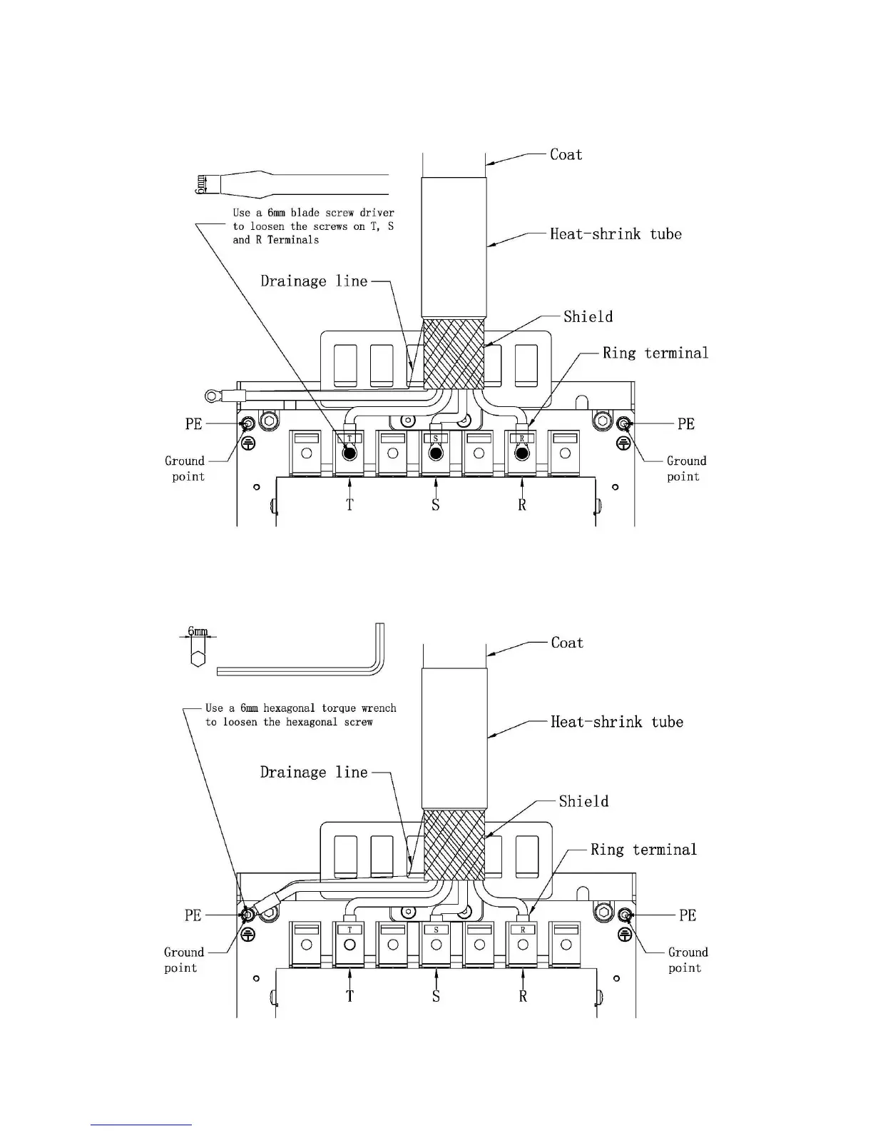 corresponding terminals: T to T, S to S and R to R. Then use a 6mm blade screw driver to tight the