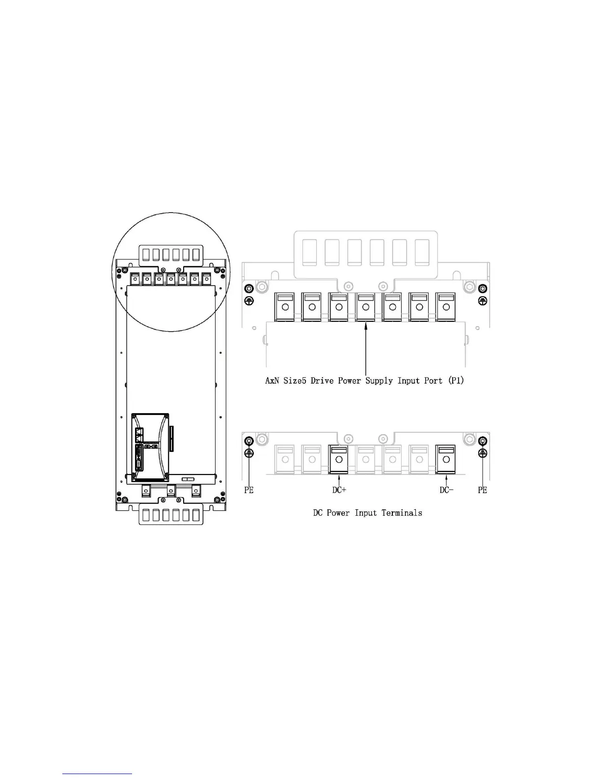 PE, DC+ and DC-, these are the three terminals called DC Power Input Terminals. AxN Size5 Drive’s