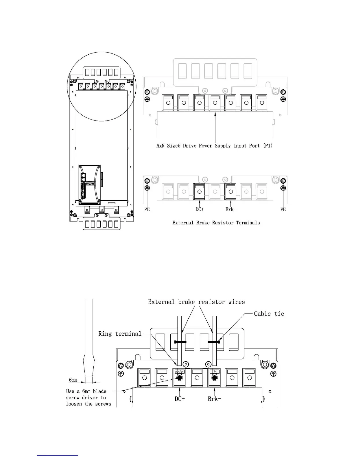 Use a 6mm blade screw driver to loosen the screws on DC+ and Brk- Terminals which are in the