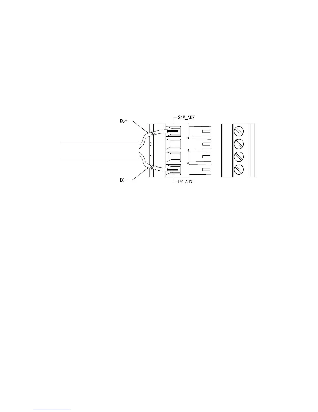 Insert DC+ wire into terminal 24V_AUX and insert DC- wire into PE_AUX, then use a screwdriver to