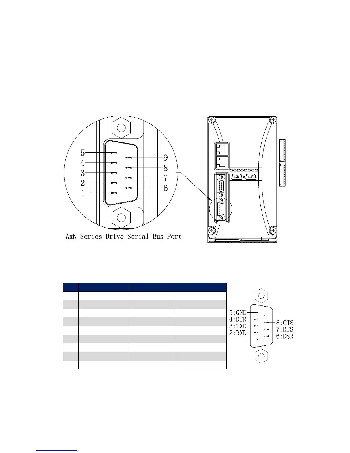 AxN Series Drive’s Serial Bus Port (Male Plug, 9 Pin D-Sub) is on the downside of drive‘s