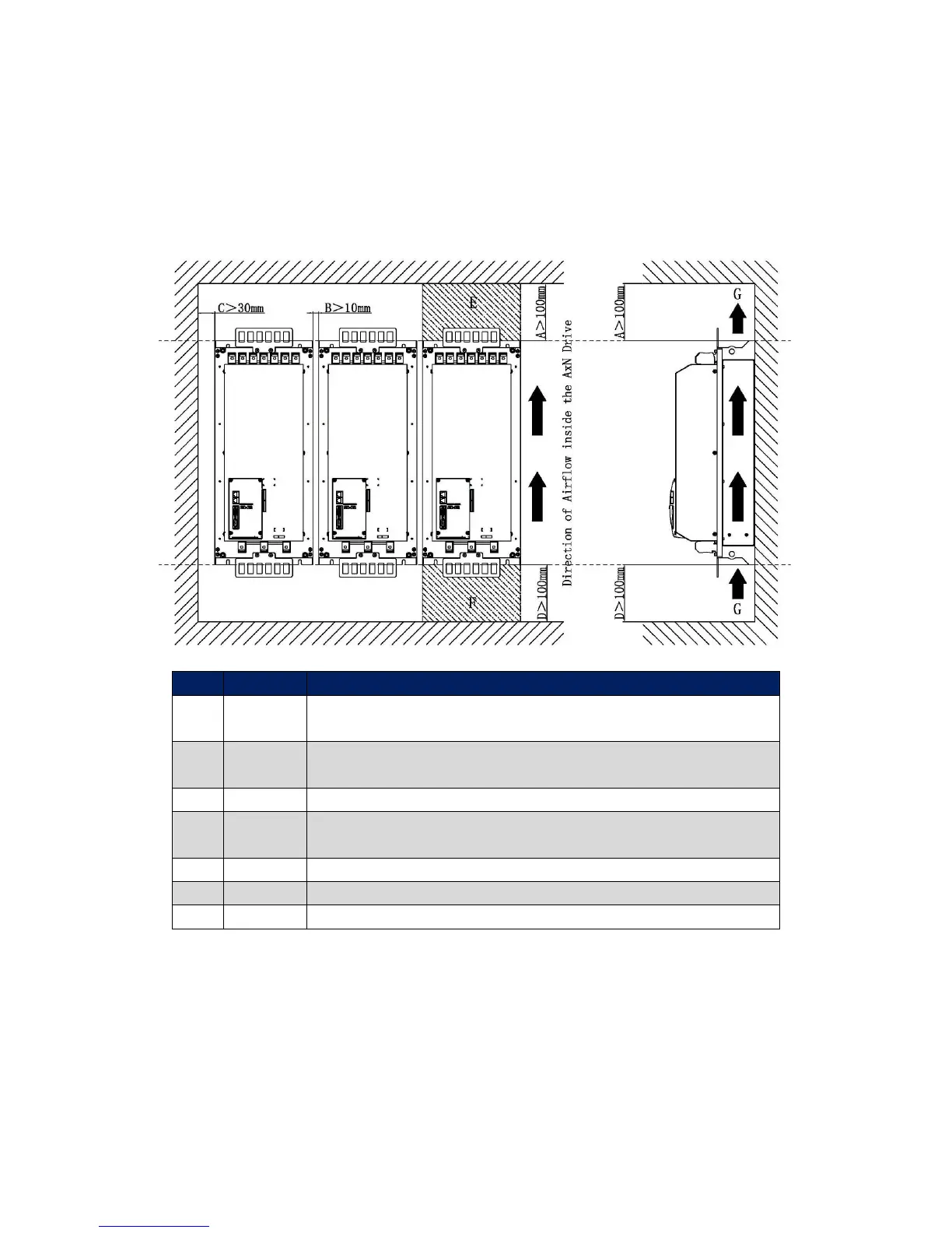 To maintain sufficient space for airflow and wiring, the space between AxN drive and other device