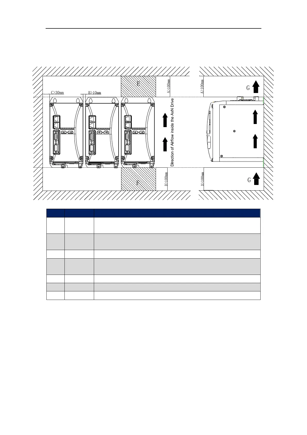 To maintain sufficient space for airflow and wiring, the space between AxN drive and other device