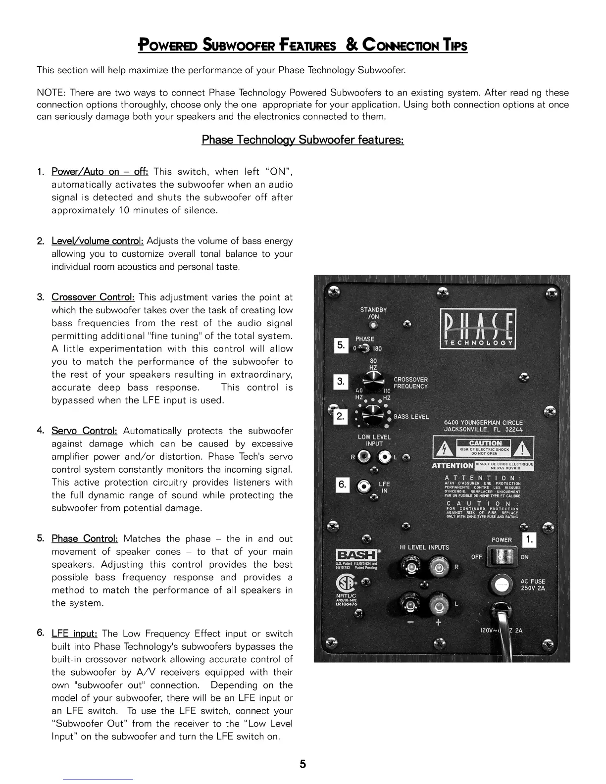 Phase Velocity Series - Powered Subwoofer Features & Connection Tips; Operational Controls; Protection and Input