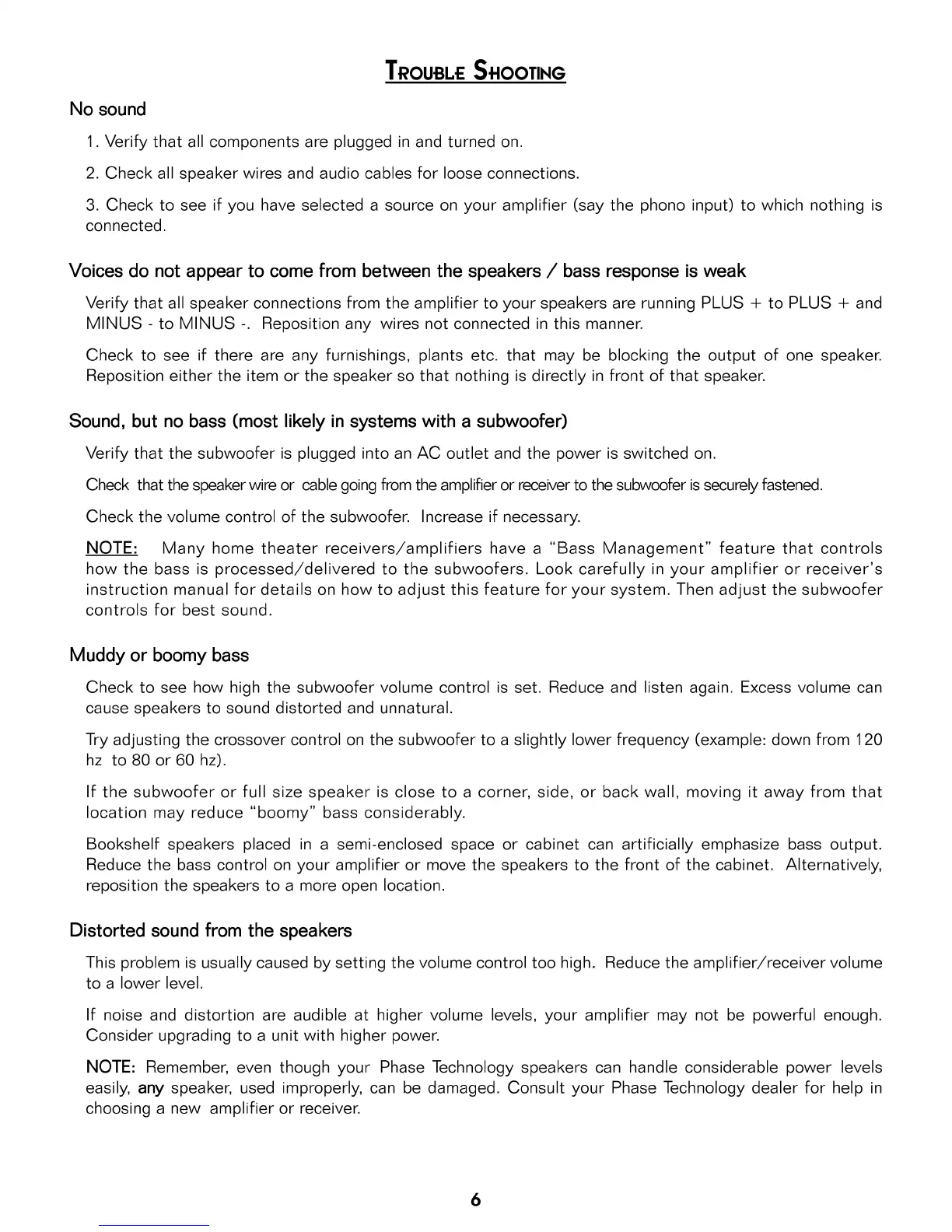 Phase Velocity Series - Trouble Shooting; No sound; Weak Bass or Off-Center Vocals; Sound, but no bass